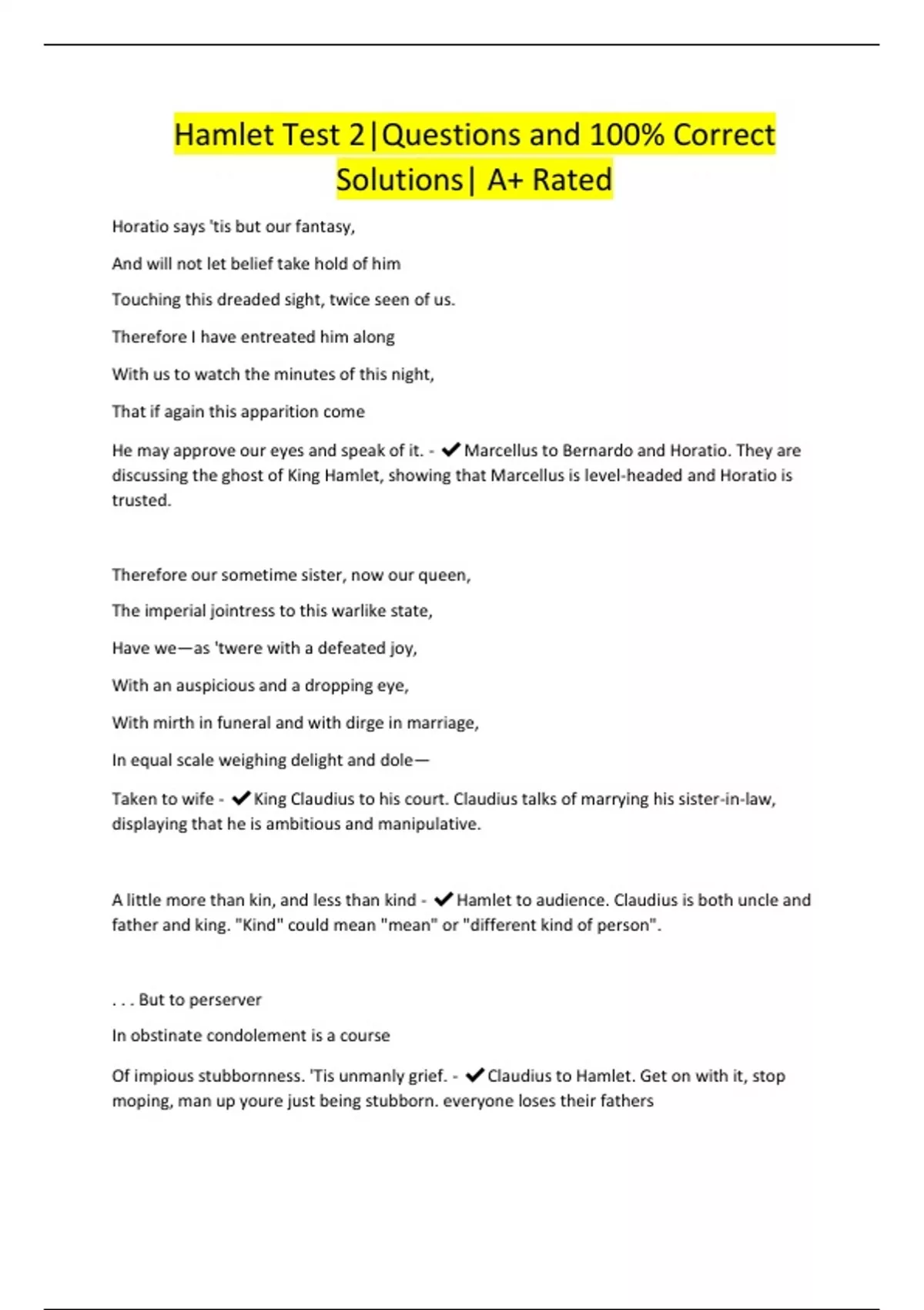 Hamlet Test 2|Questions and 100% Correct Solutions| A+ Rated