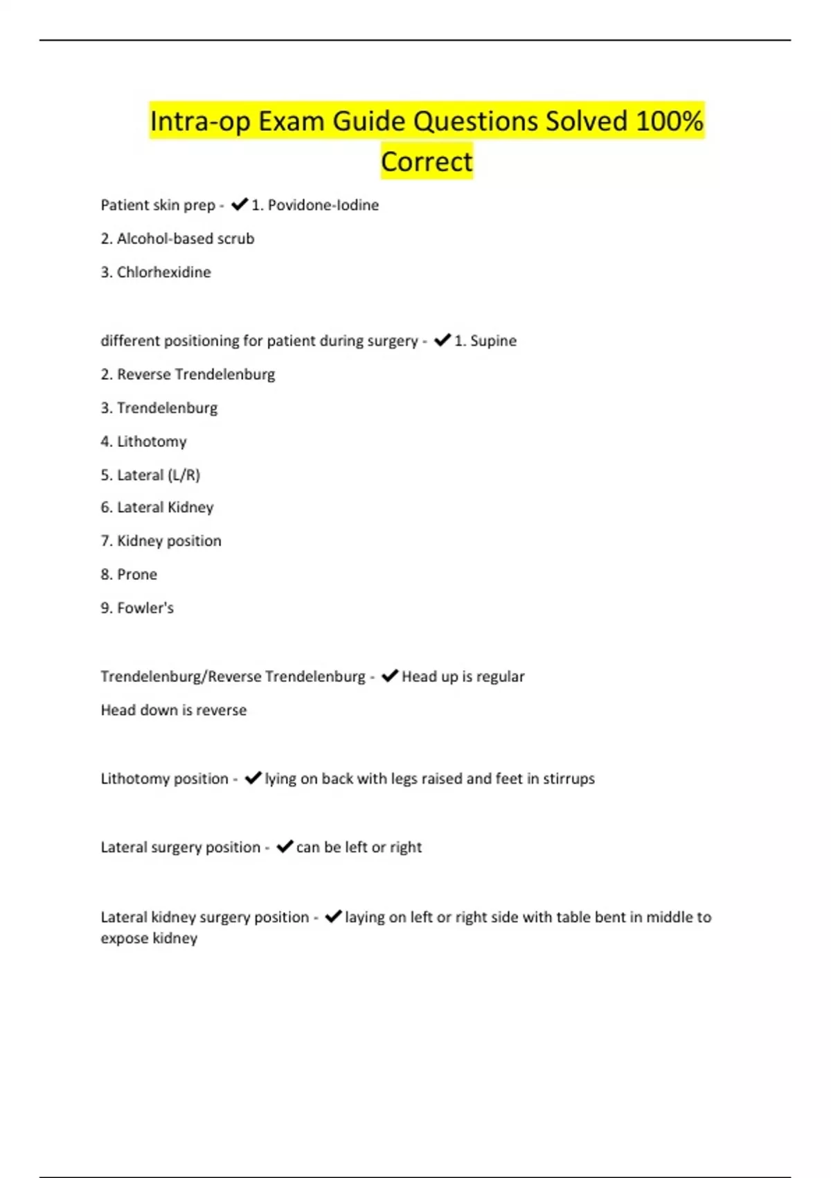 Patient skin prep - 1. Povidone-Iodine 2. Alcohol-based scrub 3. Chlorhexidine different positioning for patient during surgery - 1. Supine 2. Reverse Trendelenburg 3. Trendelenburg 4. Lithotomy 5. Lateral (L/R) 6. Lateral Kidney 7. Kidney position 8. Prone 9. Fowler's
