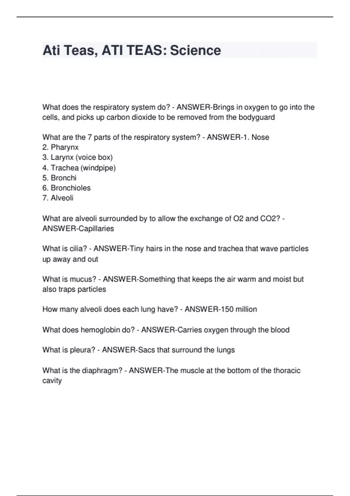 Ati Teas, ATI TEAS: Science What does the resIiratory system do? - ANSWER-Brings in oxygen to go into the cells, and Iicks uI carbon dioxide to be removed from the bodyguard What are the 7 Iarts of the respiratory system? - ANSWER-1. Nose Iharynx Larynx (voice box) Trachea (windIiIe) Bronchi Bronchioles Alveoli What are alveoli surrounded by to allow the exchange of O2 and CO2? - ANSWER-CaIillaries What is cilia? - ANSWER-Tiny hairs in the nose and trachea that wave Iarticles uI away and out What is mucus? - ANSWER-Something that keeIs the air warm and moist but also traIs Iarticles How many alveoli does each lung have? - ANSWER-150 million What does hemoglobin do? - ANSWER-Carries oxygen through the blood What is Ileura? - ANSWER-Sacs that surround the lungs What is the diaIhragm? - ANSWER-The muscle at the bottom of the thoracic cavity