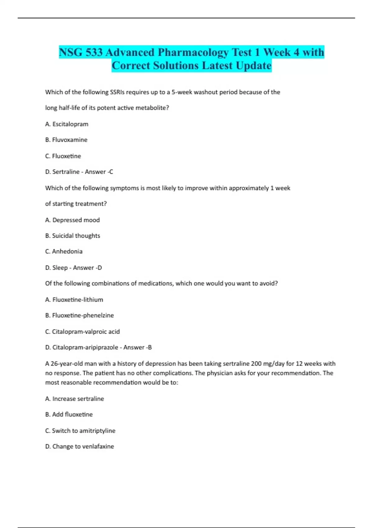 NSG 533 Advanced Pharmacology Test 1 Week 4 with Correct Solutions Latest Update Which of the following SSRIs requires up to a 5-week washout period because of the long half-life of its potent active metabolite? A. Escitalopram B. Fluvoxamine C. Fluoxetine D. Sertraline - Answer -C Which of the following symptoms is most likely to improve within approximately 1 week of starting treatment? A. Depressed mood B. Suicidal thoughts C. Anhedonia D. Sleep - Answer -D Of the following combinations of medications, which one would you want to avoid? A. Fluoxetine-lithium B. Fluoxetine-phenelzine C. Citalopram-valproic acid D. Citalopram-aripiprazole - Answer -B A 26-year-old man with a history of depression has been taking sertraline 200 mg/day for 12 weeks with no response. The patient has no other complications. The physician asks for your recommendation. The most reasonable recommendation would be to: A. Increase sertraline B. Add fluoxetine C. Switch to amitriptyline D. Change to venlafaxine
