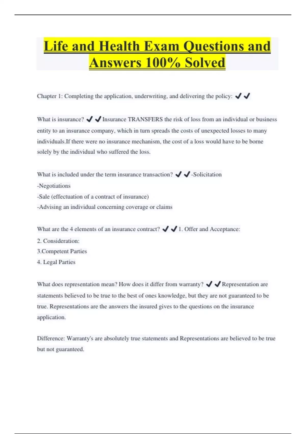 Life and Health Exam Questions and Answers 100% Solved Chapter 1: Completing the application, underwriting, and delivering the policy: ️️ What is insurance? ️️Insurance TRANSFERS the risk of loss from an individual or business entity to an insurance company, which in turn spreads the costs of unexpected losses to many individuals.If there were no insurance mechanism, the cost of a loss would have to be borne solely by the individual who suffered the loss. What is included under the term insurance transaction? ️️-Solicitation -Negotiations -Sale (effectuation of a contract of insurance) -Advising an individual concerning coverage or claims What are the 4 elements of an insurance contract? ️️1. Offer and Acceptance: 2. Consideration: 3.Competent Parties 4. Legal Parties