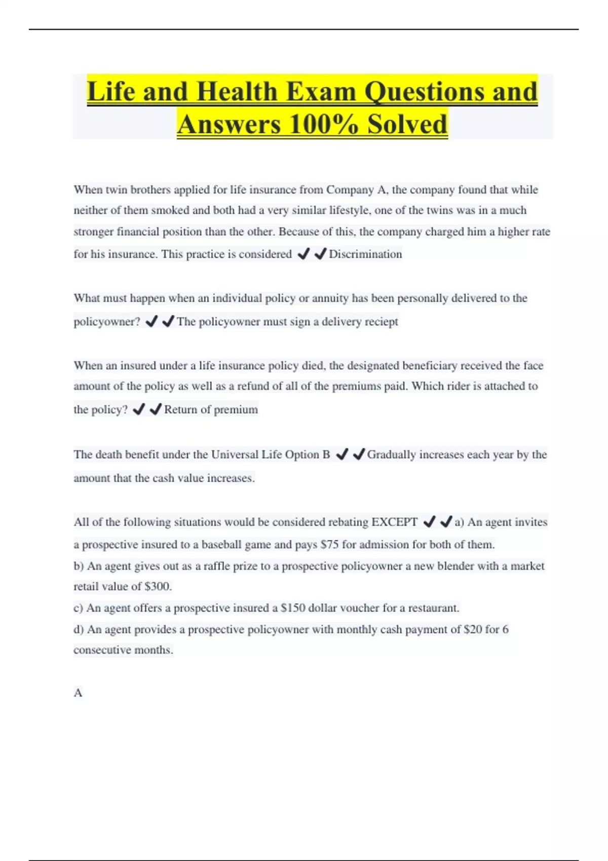 Life and Health Exam Questions and Answers 100% Solved When twin brothers applied for life insurance from Company A, the company found that while neither of them smoked and both had a very similar lifestyle, one of the twins was in a much stronger financial position than the other. Because of this, the company charged him a higher rate for his insurance. This practice is considered ️️Discrimination What must happen when an individual policy or annuity has been personally delivered to the policyowner? ️️The policyowner must sign a delivery reciept When an insured under a life insurance policy died, the designated beneficiary received the face amount of the policy as well as a refund of all of the premiums paid. Which rider is attached to the policy? ️️Return of premium The death benefit under the Universal Life Option B ️️Gradually increases each year by the amount that the cash value increases