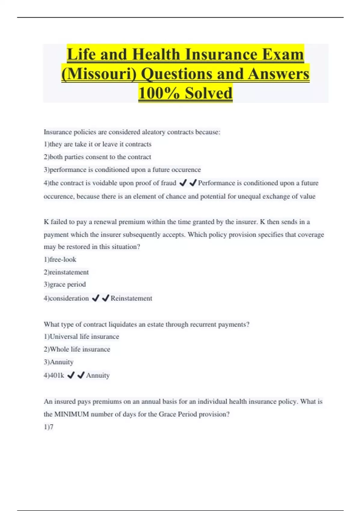 Life and Health Insurance Exam (Missouri) Questions and Answers 100% Solved Insurance policies are considered aleatory contracts because: 1)they are take it or leave it contracts 2)both parties consent to the contract 3)performance is conditioned upon a future occurence 4)the contract is voidable upon proof of fraud ️️Performance is conditioned upon a future occurence, because there is an element of chance and potential for unequal exchange of value K failed to pay a renewal premium within the time granted by the insurer. K then sends in a payment which the insurer subsequently accepts. Which policy provision specifies that coverage may be restored in this situation? 1)free-look 2)reinstatement 3)grace period 4)consideration ️️Reinstatement What type of contract liquidates an estate through recurrent payments? 1)Universal life insurance 2)Whole life insurance 3)Annuity 4)401k ️️Annuity