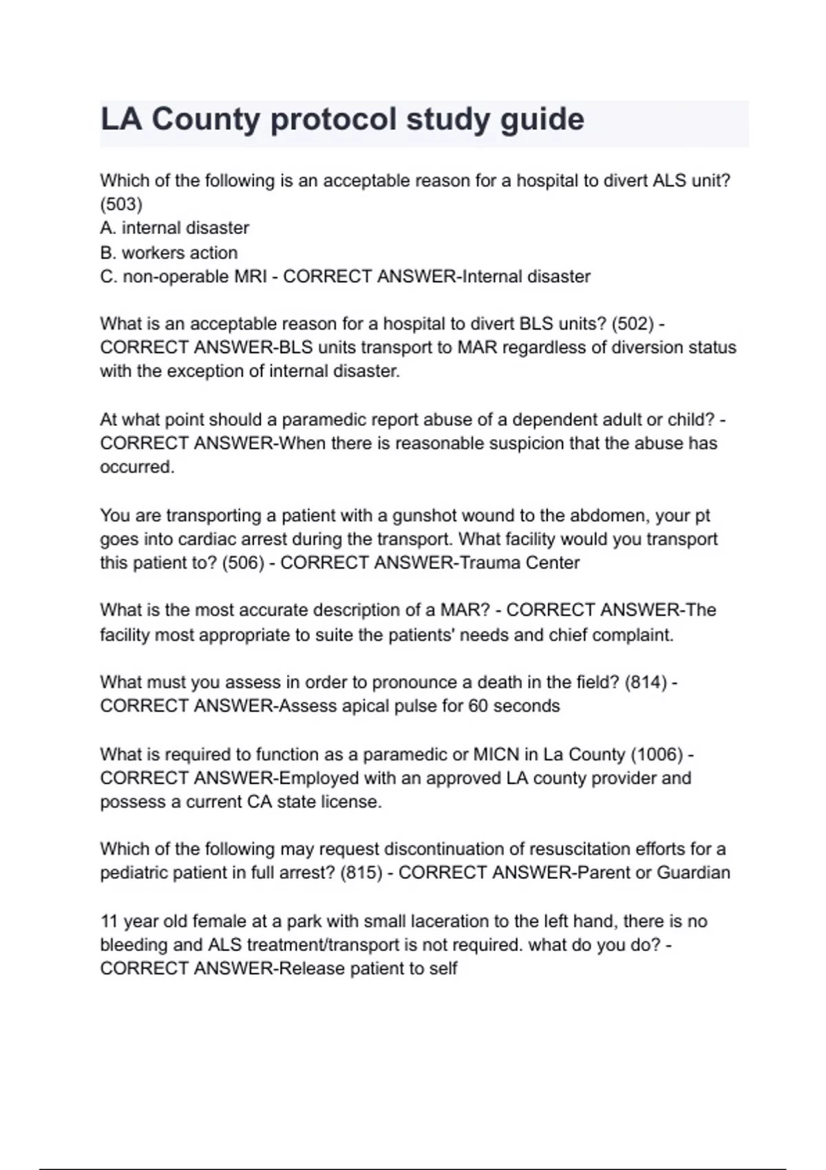 LA County protocol study guide Which of the following is an acceptable reason for a hospital to divert ALS unit? (503) A. internal disaster B. workers action C. non-operable MRI - CORRECT ANSWER-Internal disaster What is an acceptable reason for a hospital to divert BLS units? (502) - CORRECT ANSWER-BLS units transport to MAR regardless of diversion status with the exception of internal disaster. At what point should a paramedic report abuse of a dependent adult or child? - CORRECT ANSWER-When there is reasonable suspicion that the abuse has occurred. You are transporting a patient with a gunshot wound to the abdomen, your pt goes into cardiac arrest during the transport. What facility would you transport this patient to? (506) - CORRECT ANSWER-Trauma Center What is the most accurate description of a MAR? - CORRECT ANSWER-The facility most appropriate to suite the patients' needs and chief complaint. What must you assess in order to pronounce a death in the field? (814) - CORRECT ANSWER-Assess apical pulse for 60 seconds What is required to function as a paramedic or MICN in La County (1006) - CORRECT ANSWER-Employed with an ap