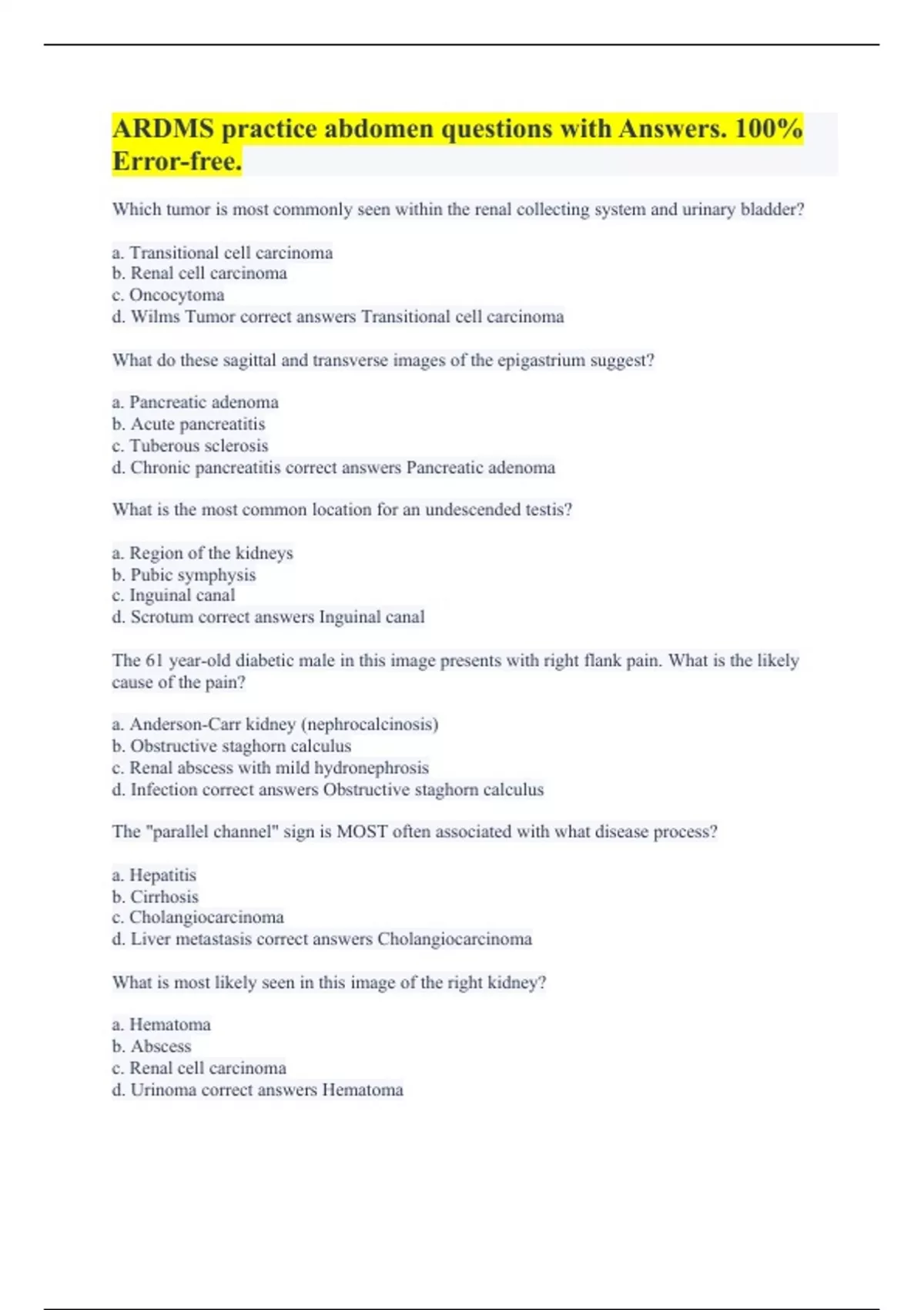 Which tumor is most commonly seen within the renal collecting system and urinary bladder? a. Transitional cell carcinoma b. Renal cell carcinoma c. Oncocytoma d. Wilms Tumor correct answers Transitional cell carcinoma What do these sagittal and transverse images of the epigastrium suggest? a. Pancreatic adenoma b. Acute pancreatitis c. Tuberous sclerosis d. Chronic pancreatitis correct answers Pancreatic adenoma What is the most common location for an undescended testis? a. Region of the kidneys b. Pubic symphysis c. Inguinal canal d. Scrotum correct answers Inguinal canal The 61 year-old diabetic male in this image presents with right flank pain. What is the likely cause of the pain? a. Anderson-Carr kidney (nephrocalcinosis) b. Obstructive staghorn calculus c. Renal abscess with mild hydronephrosis d. Infection correct answers Obstructive staghorn calculus The "parallel channel" sign is MOST often associated with what disease process? a. Hepatitis b. Cirrhosis c. Cholangiocarcinoma d. Liver metastasis correct answers Cholangiocarcinoma What is most likely seen in this image of the right kidney? a. Hematoma b. Abscess c. Renal cell carcinoma d. Urinoma correct answers Hematoma
