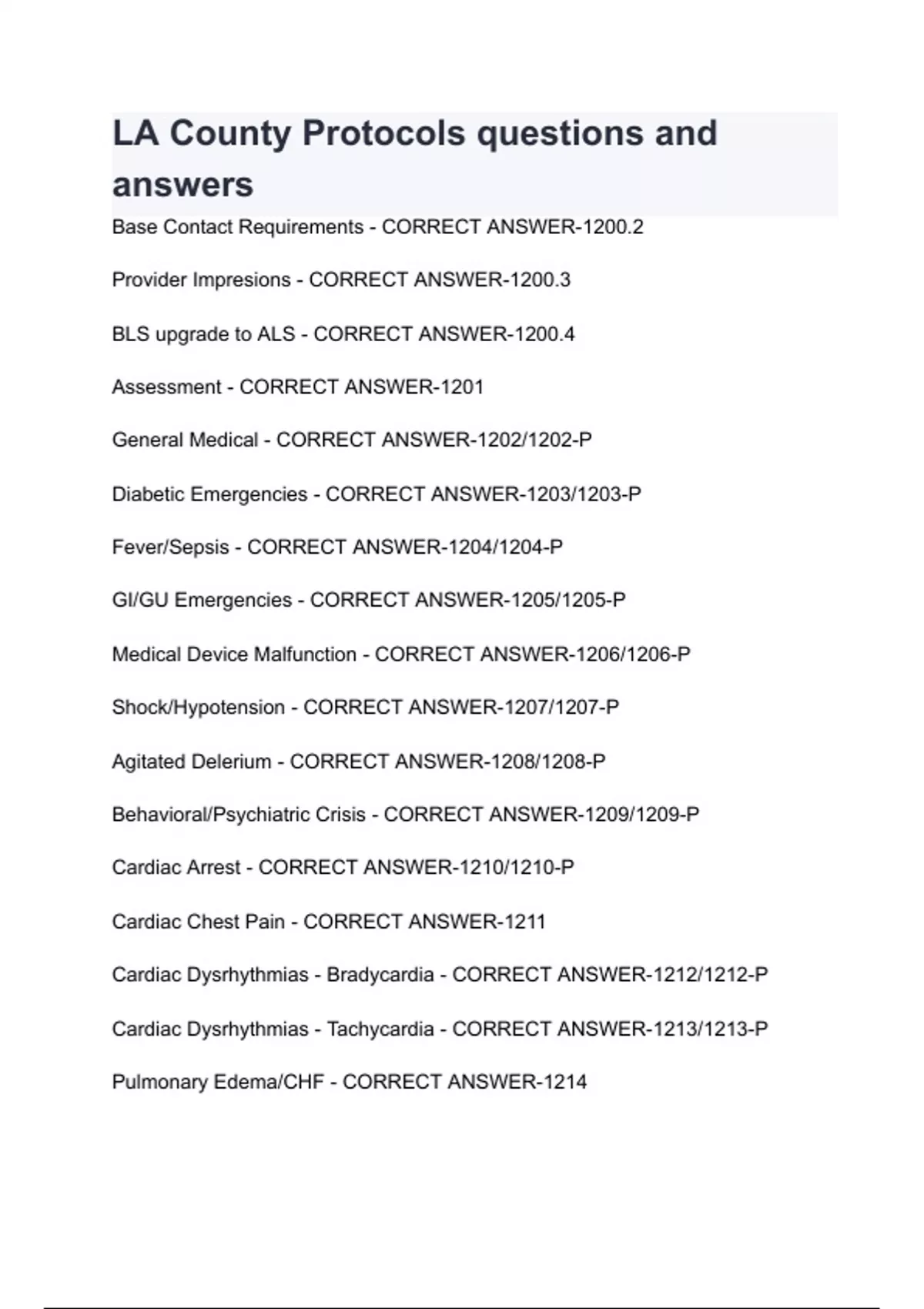 Base Contact Requirements - CORRECT ANSWER-1200.2 Provider Impresions - CORRECT ANSWER-1200.3 BLS upgrade to ALS - CORRECT ANSWER-1200.4 Assessment - CORRECT ANSWER-1201 General Medical - CORRECT ANSWER-1202/1202-P Diabetic Emergencies - CORRECT ANSWER-1203/1203-P Fever/Sepsis - CORRECT ANSWER-1204/1204-P GI/GU Emergencies - CORRECT ANSWER-1205/1205-P Medical Device Malfunction - CORRECT ANSWER-1206/1206-P Shock/Hypotension - CORRECT ANSWER-1207/1207-P Agitated Delerium - CORRECT ANSWER-1208/1208-P Behavioral/Psychiatric C