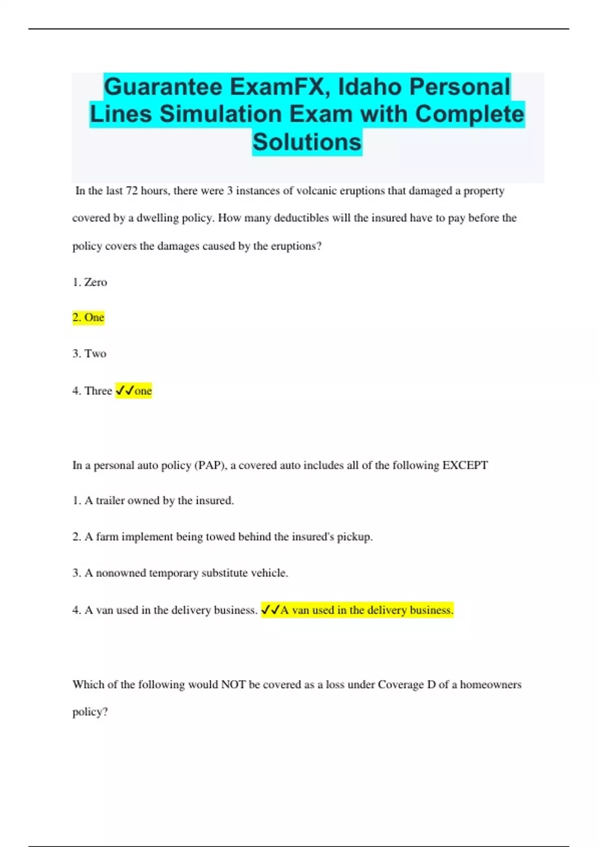 Guarantee ExamFX, Idaho Personal Lines Simulation Exam with Complete Solutions In the last 72 hours, there were 3 instances of volcanic eruptions that damaged a property covered by a dwelling policy. How many deductibles will the insured have to pay before the policy covers the damages caused by the eruptions? 1. Zero 2. One 3. Two 4. Three one In a personal auto policy (PAP), a covered auto includes all of the following EXCEPT 1. A trailer owned by the insured. 2. A farm implement being towed behind the insured's pickup. 3. A nonowned temporary substitute vehicle. 4. A van used in the delivery business. A van used in the delivery business. Which of the following would NOT be covered as a loss under Coverage D of a homeowners policy? 1. An insured has an apartment in his home. The tenant's negligence started a fire, and the apartment was not fit to live in for 4 months while repairs were being completed. 2. After a fire in a building next to the insured's home, the insured could not occupy his home, and had to stay at a motel for one week. 3. An insured's home is damaged by fire. The insured incurs expenses for living in a motel and having meals in a restaurant while repairs are made. 4. An insured leased a dwelling for 5 years. Two years later, the property owner died, and the new property owners wanted to make the property their principal residence, so the lease was canceled. An insured leased a dwelling for 5 years. Two years later, the property owner died, and the new property owners wanted to make the property their principal residence, so the lease was canceled. An insurance policy form that lists specific covered perils provides 1. Special peril coverage. 2. Blanket coverage. 3. Named peril coverage. 4. Open peril coverage. Named peril coverage. An insured is injured while driving his own car. Which of the following coverages will pay for the loss? 1. Part A-Liability 2. Part B - Medical Payments 3. Part C - Uninsured Motorist 4. Part D-Damage to Your Auto Part B - Medical Payments An insured believes that his insurer is not properly fulfilling its obligations regarding his policy. What section of the policy will give the insured more information about specific duties of the insurer? 1. Obligations 2. Conditions 3. Endorsements 4. Definitions Conditions *A trucking company has a $1 million umbrella policy in place. The businessowner agrees to maintain a 200/500/100 limit on auto liability, and a personal liability of $400,000. After a car accident, the business is sued. Injuries are awarded to a single injured party in the amount of $300,000. It turned out that the business actually carried only 100/250/50 auto liability limits. What is the total amount the umbrella policy will pay? 1. $100,000 2. $50,000 3. $200,000 4. $300,000 $100,000 If an insurance policy has the additional coverage provision, how does it affect the policy premium? 1. Premium will be calculated on a pro rata basis based on the amount of additional coverage. 2. There is no additional premium. 3. Premium will be recalculated when a specific loss covered by this provision occurs. 4. Additional premium will be assessed. There is no additional premium. An insured has $5,000 of medical coverage under a personal auto policy at the time of a covered accident. The insured and 3 passengers are injured. The insured's medical expenses are $8,000. The first passenger's total $4,000; the second passenger's total $6,500; and the third passenger's total $1,200. How much will the policy pay under the medical payments coverage? 1. $5,000 2. $8,000 3. $15,200 4. $19,700 $15,200 Each of the following may be insured under an HO-3 homeowners policy EXCEPT 1. The owner-occupant of a condominium unit. 2. An occupant of a dwelling under