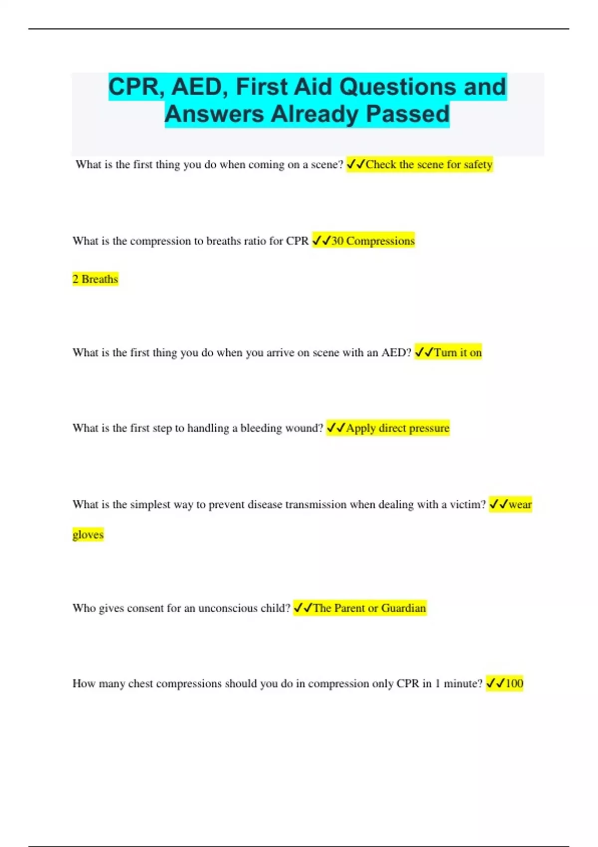 CPR, AED, First Aid Questions and Answers Already Passed