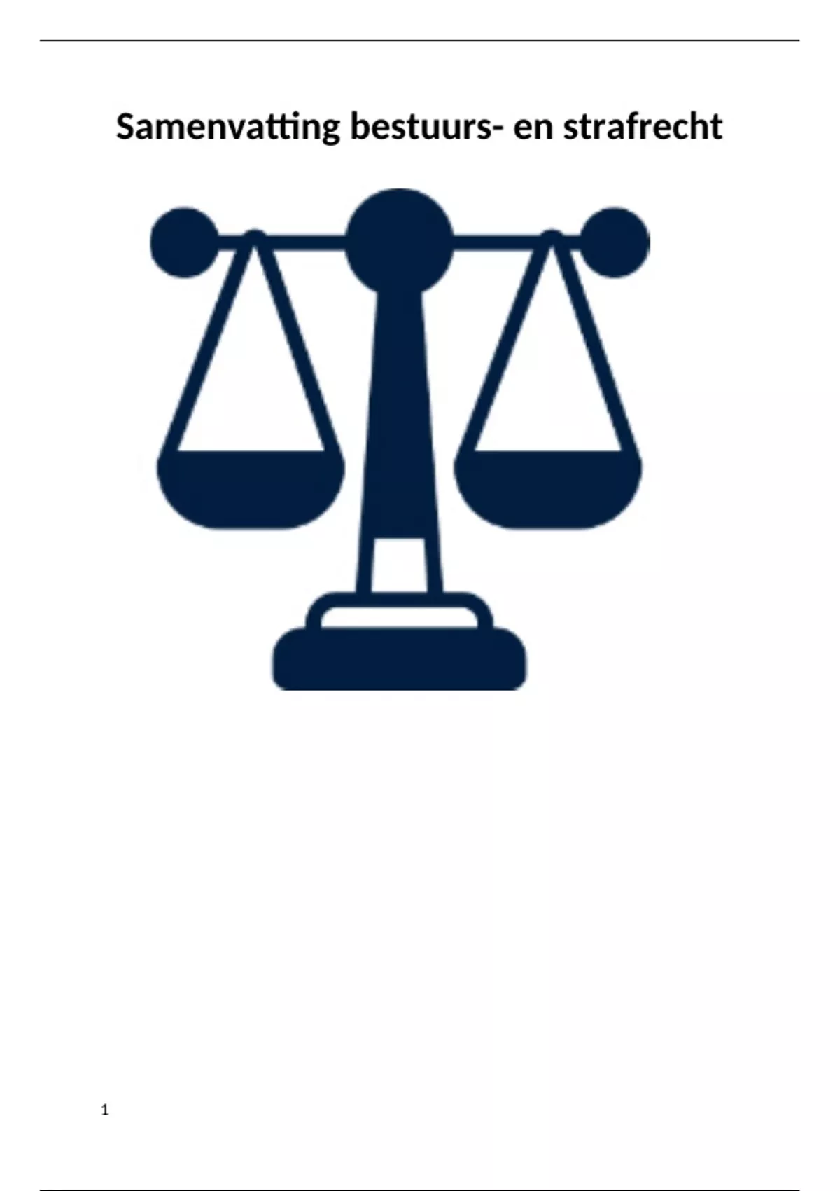 Complete samenvatting van bestuurs- en strafrecht!! Deze samenvatting bevat alle behandelde hoofdstukken van zowel hoorcolleges als werkcolleges. Er zitten ook uitgewerkte casussen bij omdat de stof beter te begrijpen. Dit geldt ook voor afbeeldingen die het verduidelijken. Ook alle belangrijke arresten worden behandeld die je moet kennen! Er is een duidelijke scheiding tussen bestuursrecht en strafrecht. Bestuursrecht: Echter, op blz. 15 (7.4.2 Procedure) Een bezwaarprocedure loopt volgens figuur 3 (!!) niet figuur 1. Ook op blz. 17 Art. 8:1 Awb bepaalt......... bij de bestuursrechter'. Niet de rechtbank... Strafrecht: Op blz. 20 (1.2 bestanddelen en elementen) de bestanddelen in een delictsomschrijving staan VOOR het woord 'wordt'. Niet er na...!