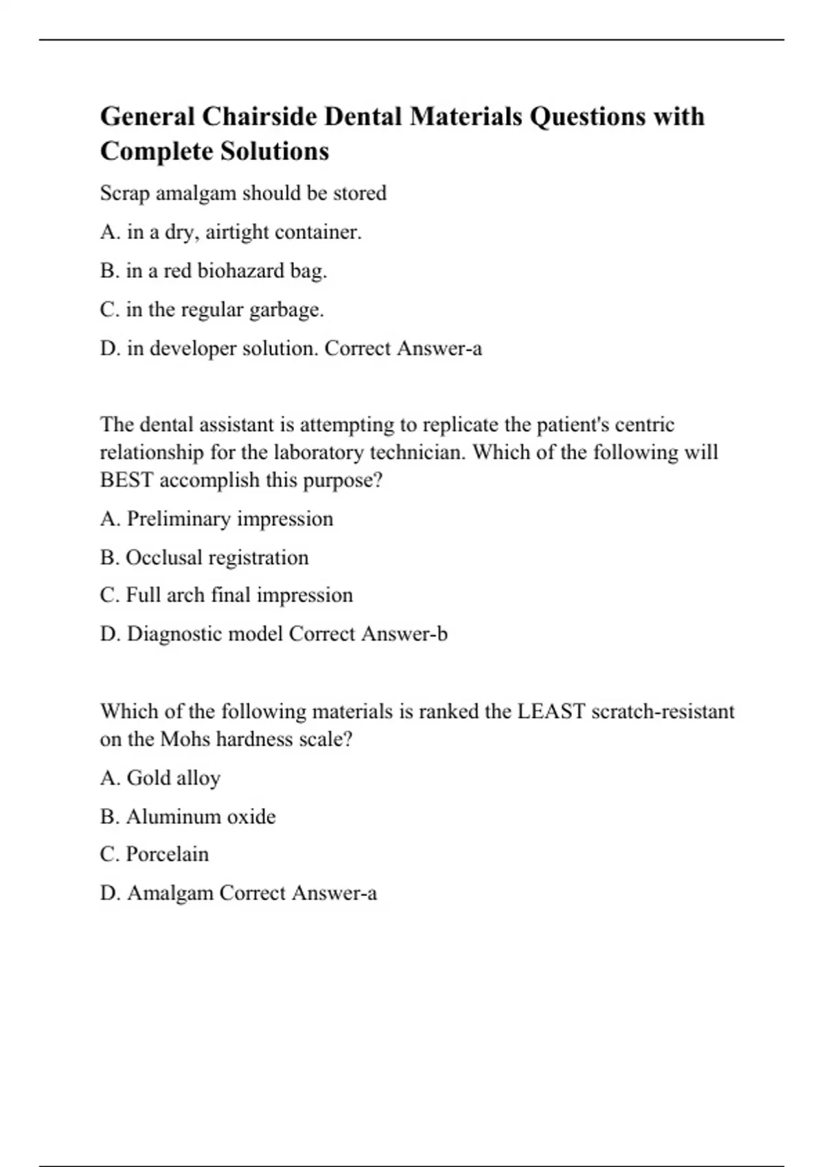 General Chairside Dental Materials Questions with Complete Solutions.