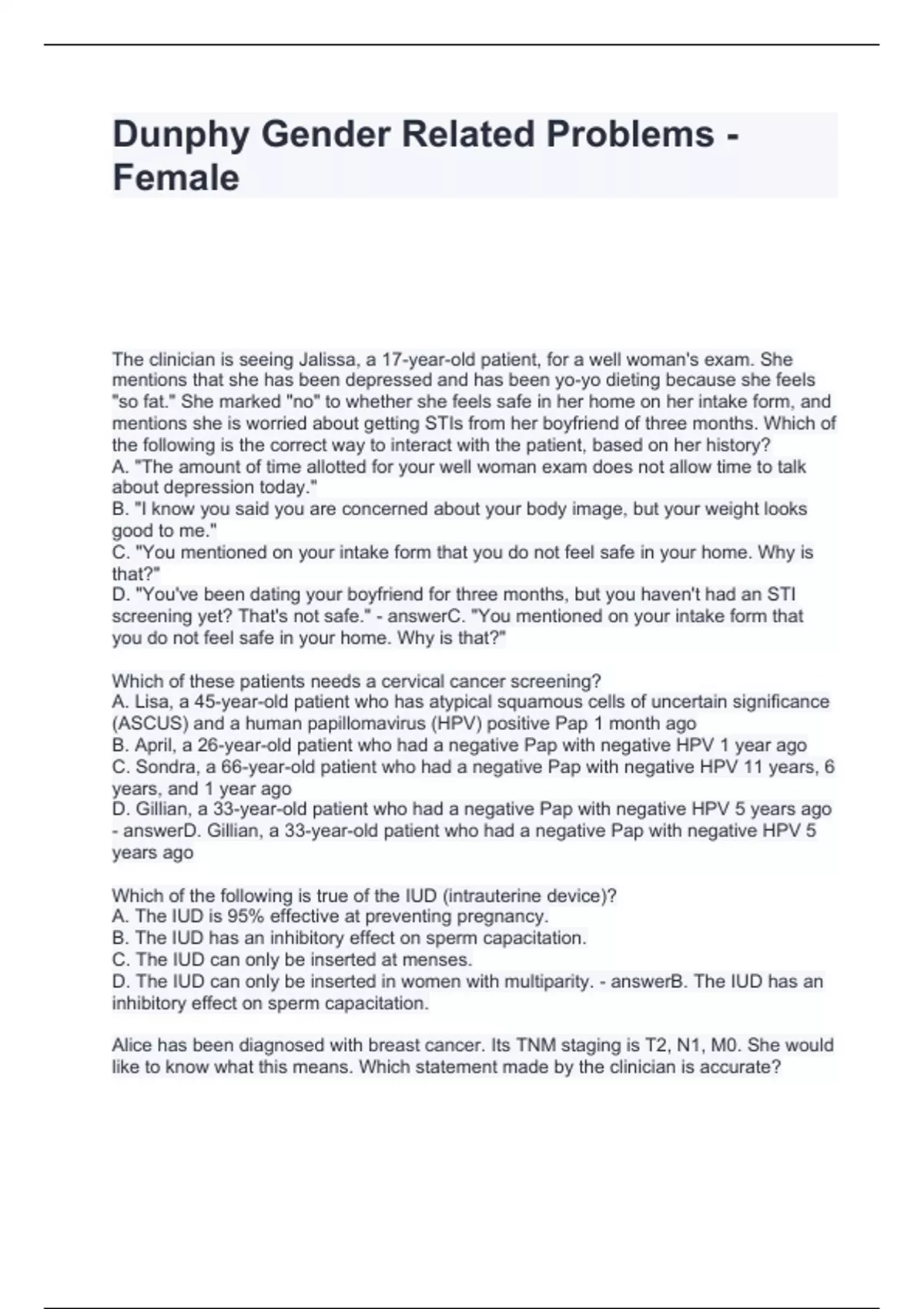 Dunphy Gender Related Problems - Female Questions and Answers Latest Updated