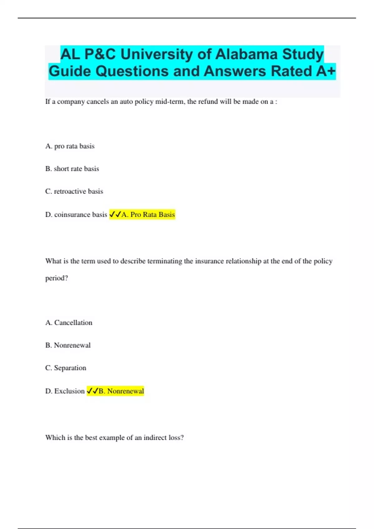 AL P&C University of Alabama Study Guide Questions and Answers Rated A+ If a company cancels an auto policy mid-term, the refund will be made on a : A. pro rata basis B. short rate basis C. retroactive basis D. coinsurance basis A. Pro Rata Basis What is the term used to describe terminating the insurance relationship at the end of the policy period? A. Cancellation B. Nonrenewal C. Separation D. Exclusion B. Nonrenewal Which is the best example of an indirect loss? A. Sequential loss B. Liability loss C. Employee theft D. Loss of use D. Loss of use Which is a two party contract? A. Property B. Casualty C. Liability D. Auto A. Property Insurance contracts offset A. speculative risk B. pure risk C. gambling D. created risk B. Pure risk Which of the following is a third party contract? A. Property B. Casualty C. Earthquake D. Theft B. Casualty Risk is best define as A. chance of loss B. certainty of loss C. financial loss D. sentimental loss A. chance of loss Being subject to a loss is A. liability B. indemnity C. exposure D. subrogation C. exposure The ranking insured in a Personal Lines contract is the A. named insured B. first named insured C. mortgagee D. husband A. named insured To be paid a claim under a P & C contract, insurable interest must exist A. At the time of application B. on the policy date C. at the time of loss D. at the time of claim settlement C. at the time of loss This type of company is run for the benefit of the policyowners: A. Stock B. Mutual C. Foreign D. Alien B. Mutual Ohio Casualty is doing regular business in Indiana. Within the same state of Indiana, Ohio Casualty would be considered a(n) A. domestic company B. nonadmitted company C. alien company D. foreign Company D. Foreign