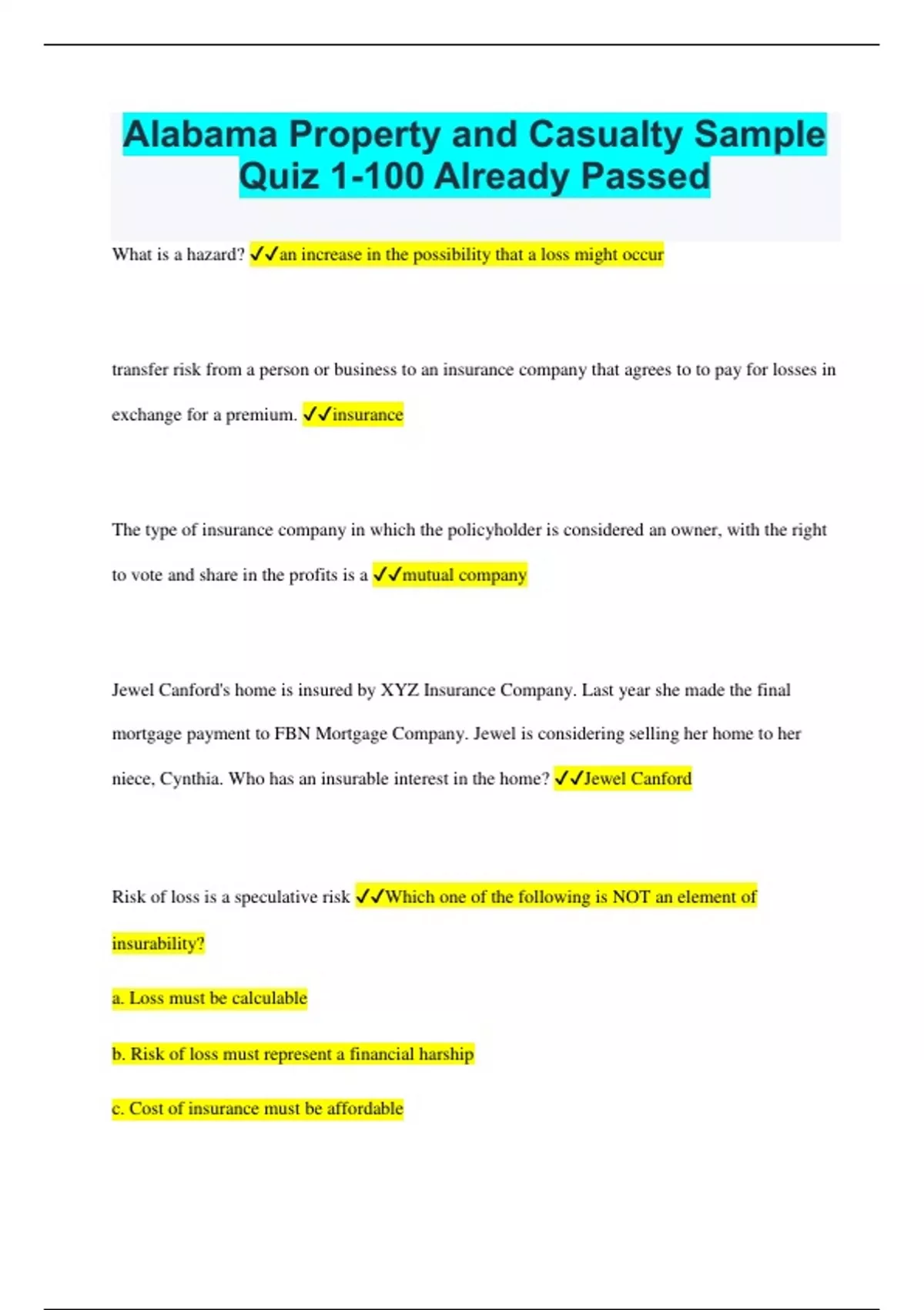 Alabama Property and Casualty Sample Quiz 1-100 Already Passed