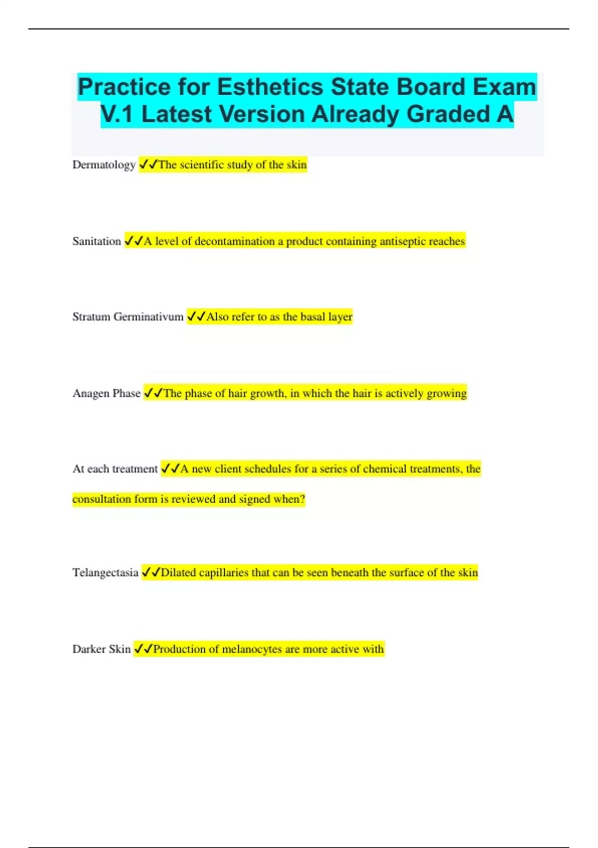 Practice for Esthetics State Board Exam V.1 Latest Version Already Graded A Dermatology The scientific study of the skin Sanitation A level of decontamination a product containing antiseptic reaches Stratum Germinativum Also refer to as the basal layer Anagen Phase The phase of hair growth, in which the hair is actively growing At each treatment A new client schedules for a series of chemical treatments, the consultation form is reviewed and signed when? Telangectasia Dilated capillaries that can be seen beneath the surface of the skin Darker Skin Production of melanocytes are more active with Facial Steamer Oxygenating the skin is one of the functions Facial Steamer Softening sebum is one of the functions Antiseptic Applied to the skin after removal of whiteheads Sebum To lubricate the skin is one of the functions Sterilization The process of destroying both harmful and beneficial bacteria Fresh laundered towels Should be kept in a closed cabinet or drawer Brushes Before disinfecting brushes they should be cleaned with soap and warm water Epithelial Tissue Melanocytes, Merkel cells, and Langerhans cells are found here Sebaceous A gland associated with a hair follicle Rhytid Medical term for wrinkle Element The simplest form of a chemical Carrier A product used to dilute an essential oil Rhytidectomy Also known as a face lift Lanugo The hair on a fetus that is extremely soft Hirsutism Glandular disturbances resulting in excess hair growth Pathogenic Bacteria that are harmful Strip Wax Also known as soft wax