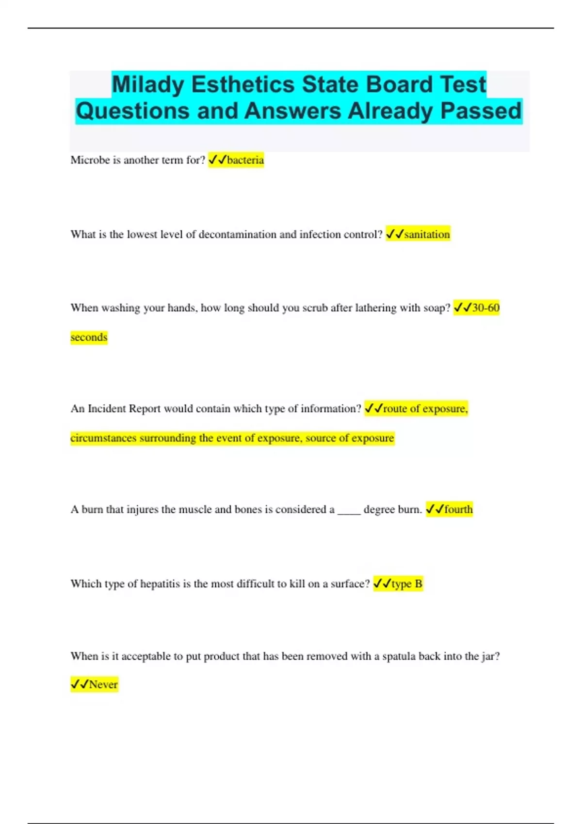 Milady Esthetics State Board Test Questions and Answers Already Passed Microbe is another term for? bacteria What is the lowest level of decontamination and infection control? sanitation When washing your hands, how long should you scrub after lathering with soap? 30-60 seconds An Incident Report would contain which type of information? route of exposure, circumstances surrounding the event of exposure, source of exposure A burn that injures the muscle and bones is considered a ____ degree burn. fourth Which type of hepatitis is the most difficult to kill on a surface? type B When is it acceptable to put product that has been removed with a spatula back into the jar? Never Bacteria multiply best in places that are? Warm Scabies is caused by? animal parasite The ______ cranial nerve is the chief motor nerve of the face. seventh The human body has how many bones? 206 The cervical nerves originate at the? spinal cord Which of these is a function of the skeletal system? provides the shape and form for the body, protects the internal organs, blood production Nonstriated muscles are also knows as what kind of muscles? involuntary, visceral, smooth How many muscles are in your face? 30 Massaging the _____ nerve affects the skin of the lower eyelid, side of the nose, upper lip, and mouth. infraoribtal What is a function of the blood? help equalize the body's temperature The average brain weighs about? 46 pounds Oxygen is? colorless, odorless & tasteless what is the lightest element known? hydrogen What has neither a definite size nor a definite shape? Gas The skin's protective barrier agains certain forms of bacteria and microorganisms is called the? acid mantle When free radicals cause an oxidation reaction they also? produce a new free radical soaps are? highly alkaline solutions are usually? transparent If a substance is hydrophilic, it is considered? water loving One advantage of O/W emulsions is that they? are easily rinsed away with water water-in-oil emulsions usually contain? a smaller