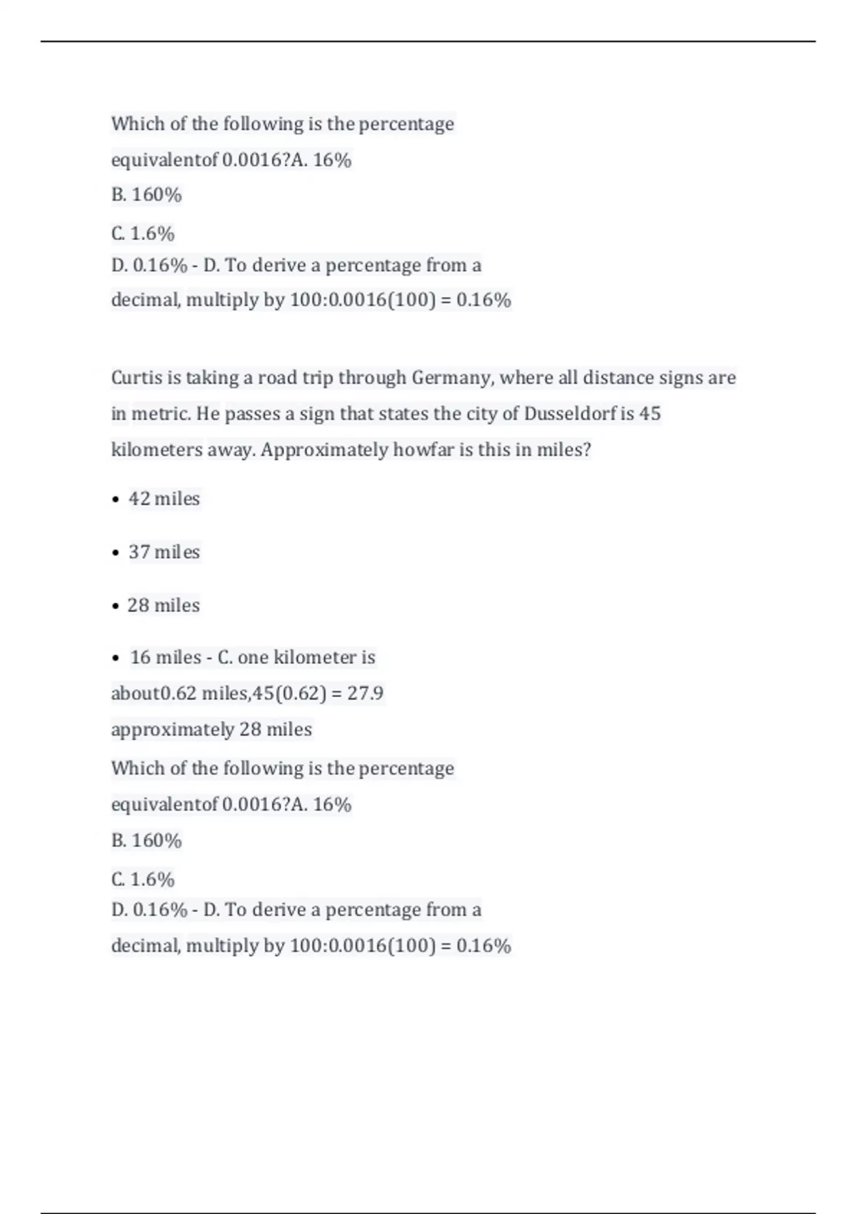 Which of the following is the percentage equivalent of 0.0016?A. 16% B. 160% C. 1.6% D. 0.16% - D. To derive a percentage from a decimal, multiply by 100:0.0016(100) = 0.16% Curtis is taking a road trip through Germany, where all distance signs are in metric. He passes a sign that states the city of Dusseldorf is 45 kilometers away. Approximately howfar is this in miles? 42 miles 37 miles 28 miles 16 miles - C. one kilometer is about 0.62 miles,45(0.62) = 27.9 approximately 28 miles