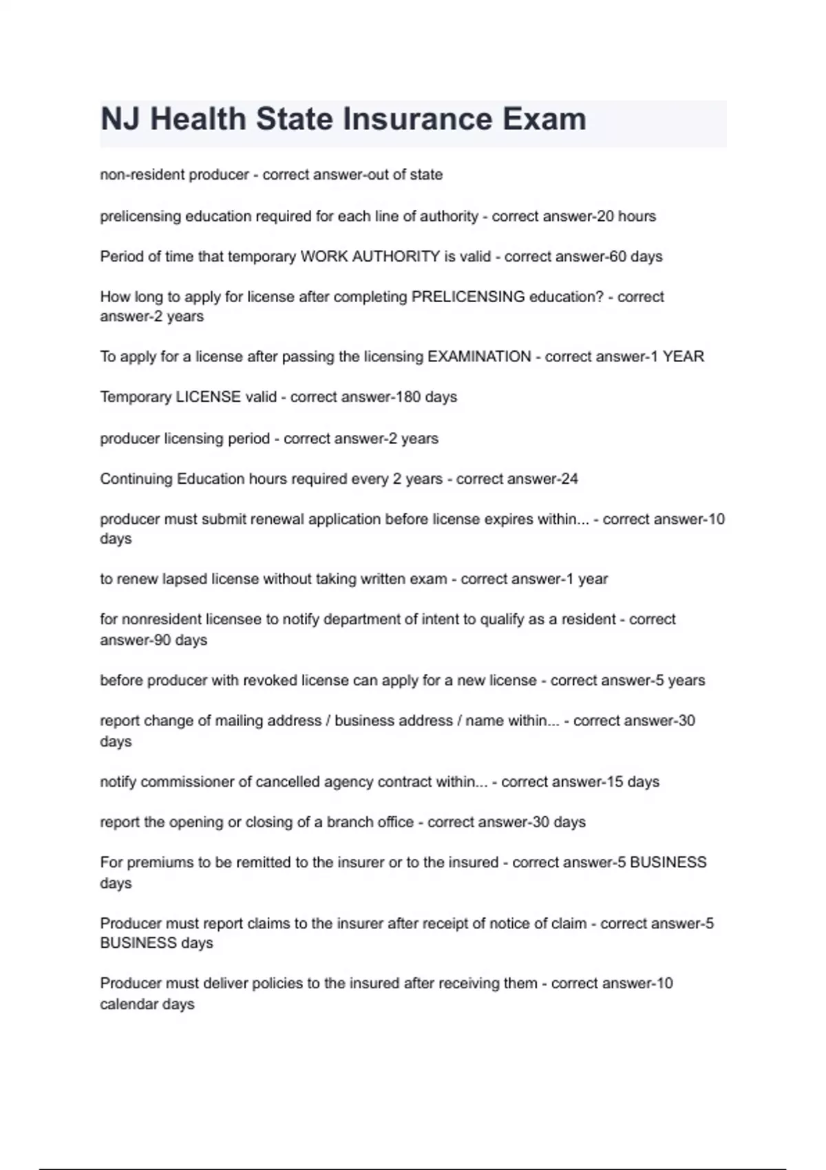 non-resident producer - correct answer-out of state prelicensing education required for each line of authority - correct answer-20 hours Period of time that temporary WORK AUTHORITY is valid - correct answer-60 days How long to apply for license after completing PRELICENSING education? - correct answer-2 years To apply for a license after passing the licensing EXAMINATION - correct answer-1 YEAR Temporary LICENSE valid - correct answer-180 days producer licensing period - correct answer-2 years Continuing Education hours required every 2 years - correct answer-24 producer must submit renewal application before license expires within... - correct answer-10 days to renew lapsed license without taking written exam - correct answer-1 year for nonresident licensee to notify department of intent to qualify as a resident - correct answer-90 days before producer with revoked license can apply for a new license - correct answer-5 years report change of mailing address / business address / name within... - correct answer-30 days notify commissioner of cancelled agency contract within... - correct answer-15 days report the opening or closing of a branch office - correct answer-30 days For premiums to be remi