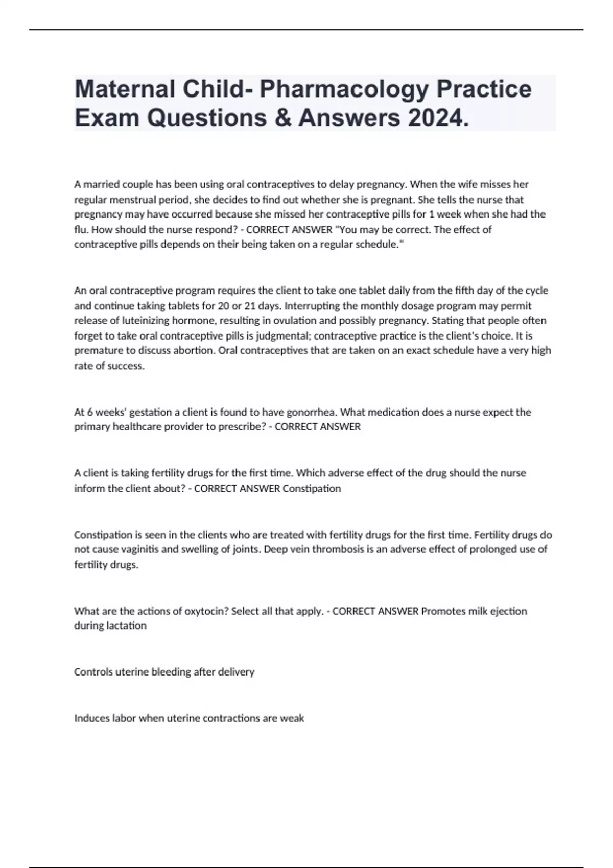 Maternal Child- Pharmacology Practice Exam Questions & Answers 2024. A married couple has been using oral contraceptives to delay pregnancy. When the wife misses her regular menstrual period, she decides to find out whether she is pregnant. She tells the nurse that pregnancy may have occurred because she missed her contraceptive pills for 1 week when she had the flu. How should the nurse respond? - CORRECT ANSWER "You may be correct. The effect of contraceptive pills depends on their being taken on a regular schedule." An oral contraceptive program requires the client to take one tablet daily from the fifth day of the cycle and continue taking tablets for 20 or 21 days. Interrupting the monthly dosage program may permit release of luteinizing hormone, resulting in ovulation and possibly pregnancy. Stating that people often forget to take oral contraceptive pills is judgmental; contraceptive practice is the client's choice. It is premature to discuss abortion. Oral contraceptives that are taken on an exact schedule have a very high rate of success. At 6 weeks' gestation a client is found to have gonorrhea. What medication does a nurse expect the primary healthcare provider to prescribe? - CORRECT ANSWER A client is taking fertility drugs for the first time. Which adverse effect of the drug should the nurse inform the client about? - CORRECT ANSWER Constipation Constipation is seen in the clients who are treated with fertility drugs for the first time. Fertility drugs do not cause vaginitis and swelling of joints. Deep vein thrombosis is an adverse effect of prolonged use of fertility drugs. What are the actions of oxytocin? Select all that apply. - CORRECT ANSWER Promotes milk ejection during lactation Controls uterine bleeding after delivery Induces labor when uterine contractions are weak