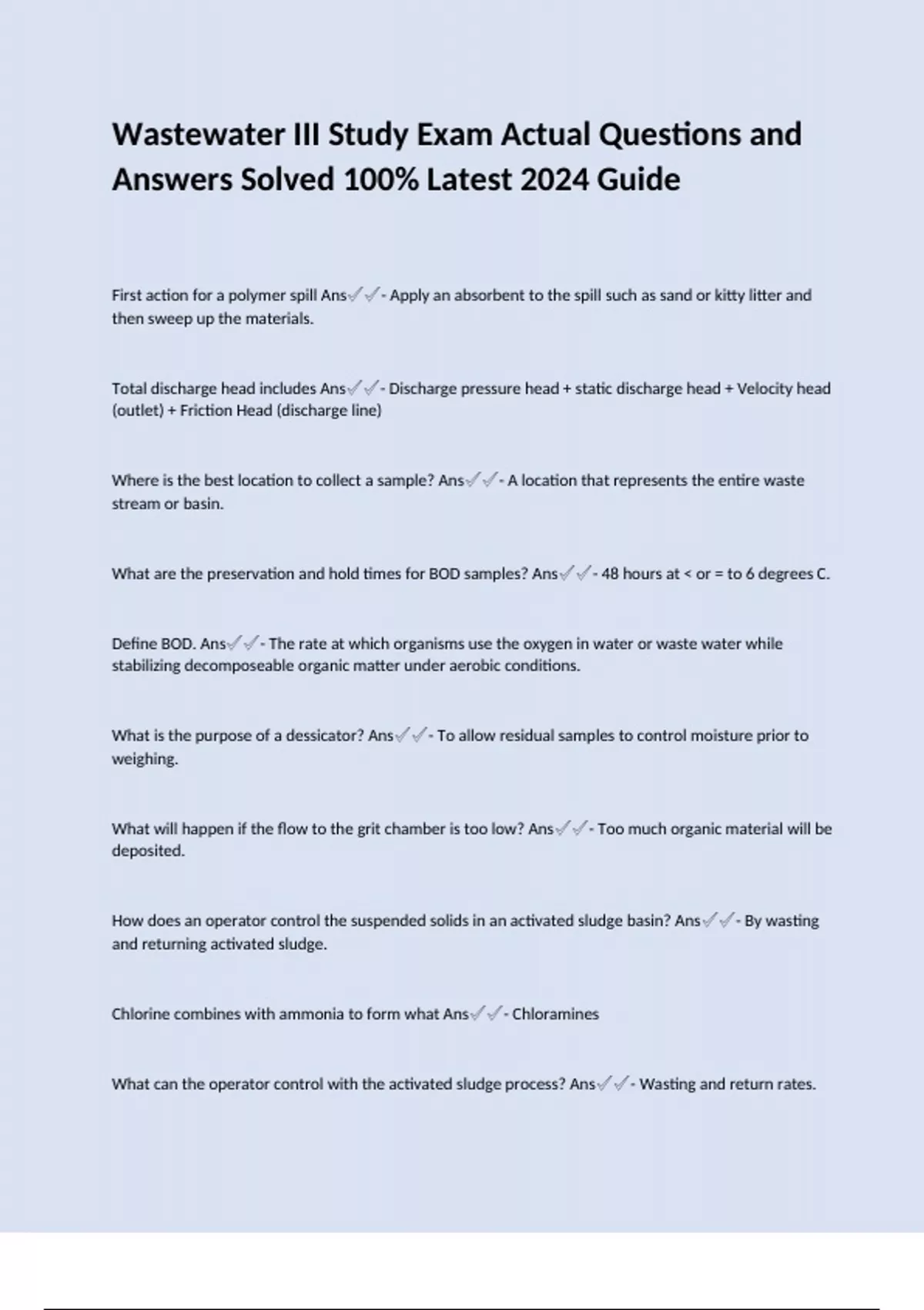 Wastewater III Study Exam Actual Questions and Answers Solved 100% Latest 2024 Guide