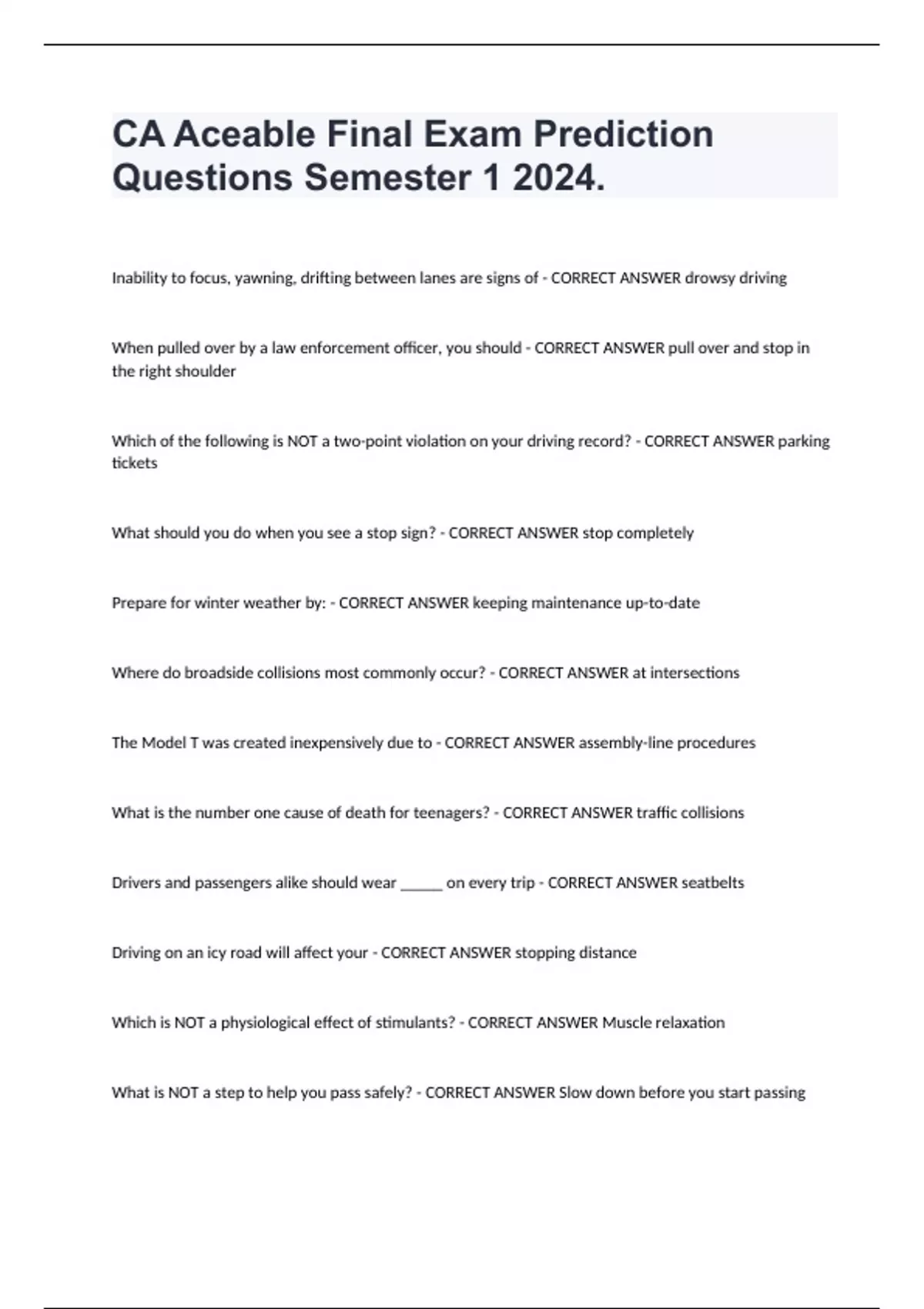 CA Aceable Final Exam Prediction Questions Semester 1 2024. Inability to focus, yawning, drifting between lanes are signs of - CORRECT ANSWER drowsy driving When pulled over by a law enforcement officer, you should - CORRECT ANSWER pull over and stop in the right shoulder Which of the following is NOT a two-point violation on your driving record? - CORRECT ANSWER parking tickets What should you do when you see a stop sign? - CORRECT ANSWER stop completely Prepare for winter weather by: - CORRECT ANSWER keeping maintenance up-to-date Where do broadside collisions most commonly occur? - CORRECT ANSWER at intersections The Model T was created inexpensively due to - CORRECT ANSWER assembly-line procedures What is the number one cause of death for teenagers? - CORRECT ANSWER traffic collisions Drivers and passengers alike should wear _____ on every trip - CORRECT ANSWER seatbelts Driving on an icy road will affect your - CORRECT ANSWER stopping distance Which is NOT a physiological effect of stimulants? - CORRECT ANSWER Muscle relaxation What is NOT a step to help you pass safely? - CORRECT ANSWER Slow down before you start passing