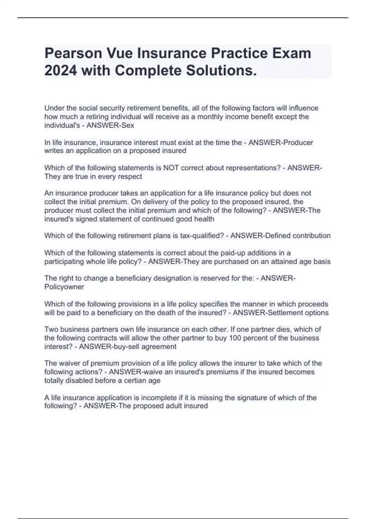 Pearson Vue Insurance Practice Exam 2024 with Complete Solutions.