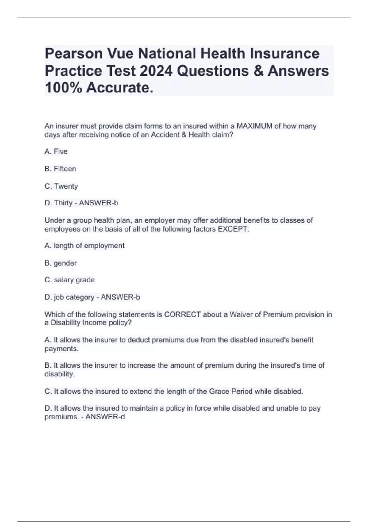 An insurer must provide claim forms to an insured within a MAXIMUM of how many days after receiving notice of an Accident & Health claim? A. Five B. Fifteen C. Twenty D. Thirty - ANSWER-b Under a group health plan, an employer may offer additional benefits to classes of employees on the basis of all of the following factors EXCEPT: A. length of employment B. gender C. salary grade D. job category - ANSWER-b Which of the following statements is CORRECT about a Waiver of Premium provision in a Disability Income policy? A. It allows the insurer to deduct premiums due from the disabled insured's benefit payments. B. It allows the insurer to increase the amount of premium during the insured's time of disability. C. It allows the insured to extend the length of the Grace Period while disabled. D. It allows the insured to maintain a policy in force while disabled and unable to pay premiums. - ANSWER-d Suicide, pre-existing conditions and self-inflicted injuries are dealt with in which of the following policy features? A. Extensions of coverage B. B