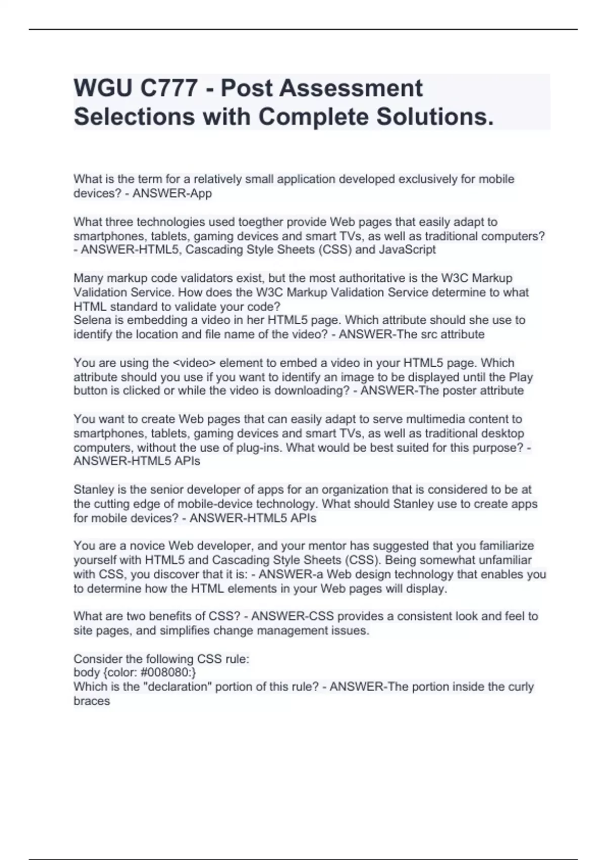 WGU C777 - Post Assessment Selections with Complete Solutions.
