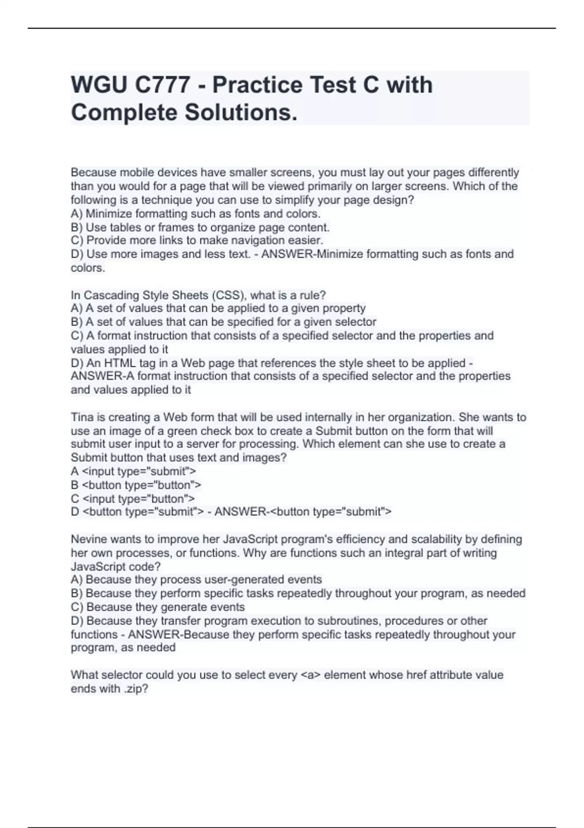 Because mobile devices have smaller screens, you must lay out your pages differently than you would for a page that will be viewed primarily on larger screens. Which of the following is a technique you can use to simplify your page design? A) Minimize formatting such as fonts and colors. B) Use tables or frames to organize page content. C) Provide more links to make navigation easier. D) Use more images and less text. - ANSWER-Minimize formatting such as fonts and colors. In Cascading Style Sheets (CSS), what is a rule? A) A set of values that can be applied to a given property B) A set of values that can be specified for a given selector C) A format instruction that consists of a specified selector and the properties and values applied to it D) An HTML tag in a Web page that references the style sheet to be applied - ANSWER-A format instruction that consists of a specified selector and the properties and values applied to it Tina is creating a Web form that will be used internally in her organization. She wants to use an image of a green check box to create a Submit button on the form that will submit user input to a server for processing. Which element can she use to create a Submit button that uses text and images? A <input type="submit"> B <button type="button"> C <input type="button"> D <button type="submit"> - ANSWER-<button type="submit"> Nevine wants to improve her JavaScript program's efficiency and scalability by defining her own processes, or functions. Why are functions such an integral part of writing JavaScript code? A) Because they process user-generated events B) Because they perform specific tasks repeatedly throughout your program, as needed C) Because they generate events D) Because they transfer program execution to subroutines, procedures or other functions - ANSWER-Because they perform specific tasks repeatedly throughout your program, as needed What selector could you use to select every <a> element whose href attribute value ends with .zip? A) a[href*=".zip"] B) a[href#=".zip"] C) a[href$=".zip"] D) a[href^=".zip"] - ANSWER-a[href$=".zip"] HTML comes in several versions. Which of the following includes the Transitional, Strict and Frameset "flavors"? A) HTML5