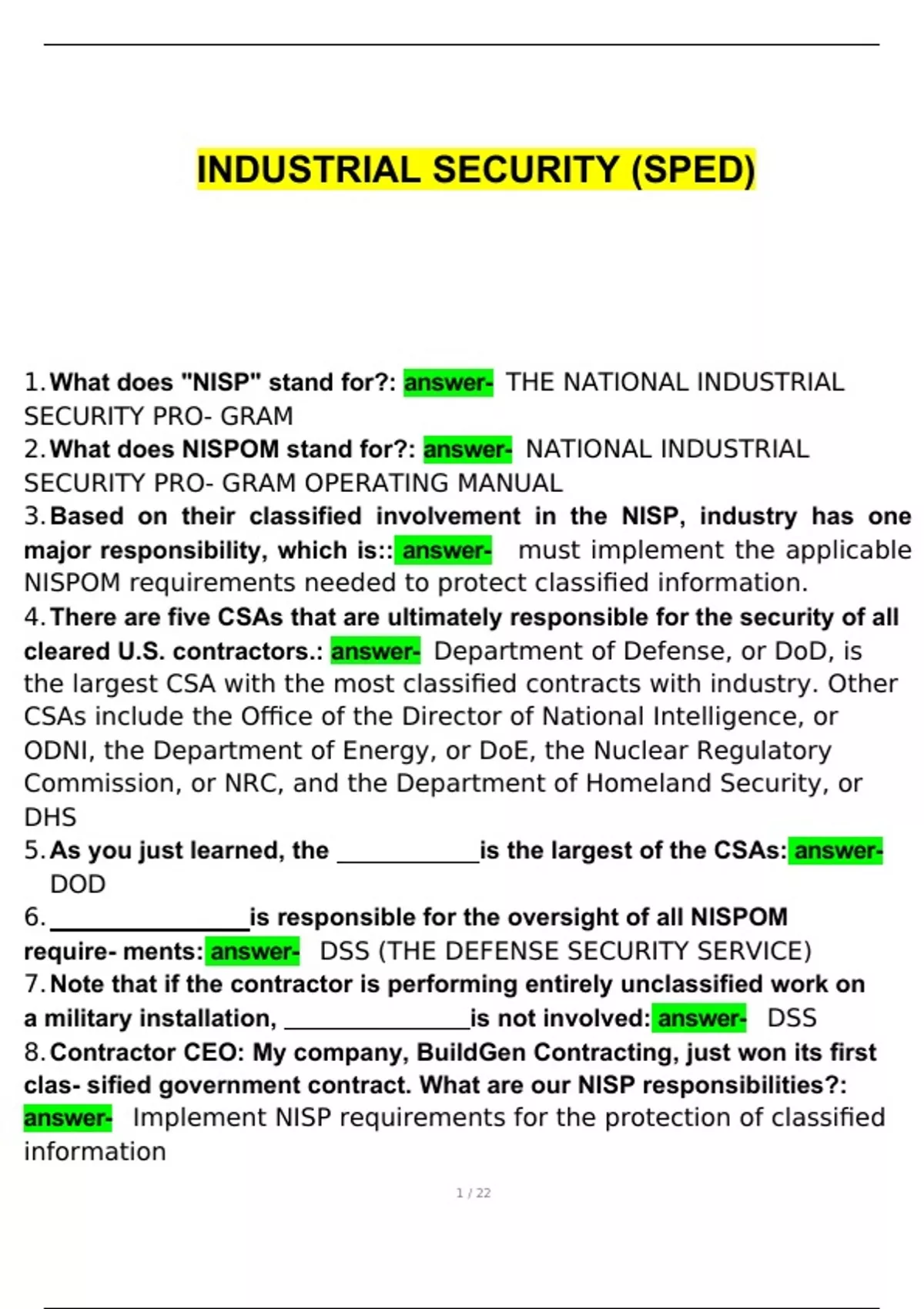 INDUSTRIAL SECURITY (SPED) Questions with Complete Solutions