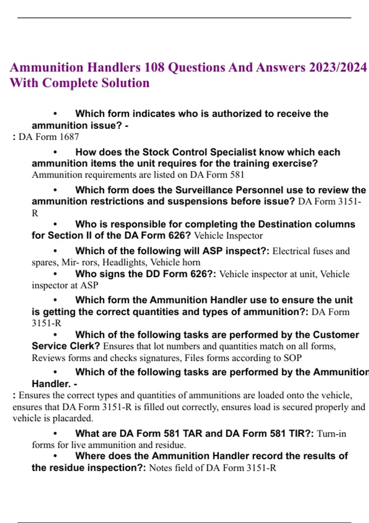 Ammunition Handlers 108 Correct Questions & Answers 2023/2024 Latest Updated With 100% Correct Answers Rated A+