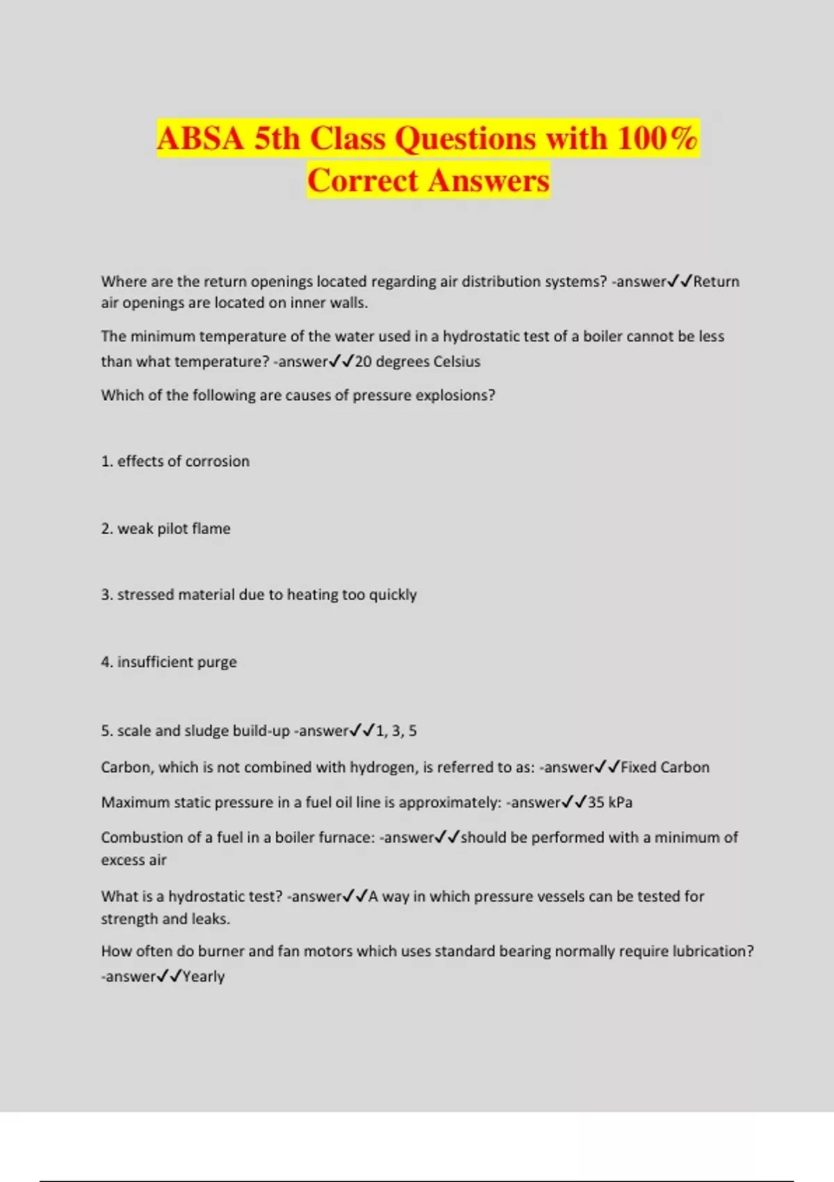 ABSA 5th Class Questions with 100% Correct Answers Where are the return openings located regarding air distribution systems? -answerReturn air openings are located on inner walls. The minimum temperature of the water used in a hydrostatic test of a boiler cannot be less than what temperature? -answer20 degrees Celsius Which of the following are causes of pressure explosions? 1. effects of corrosion 2. weak pilot flame 3. stressed material due to heating too quickly 4. insufficient purge 5. scale and sludge build-up -answer1, 3, 5 Carbon, which is not combined with hydrogen, is referred to as: -answerFixed Carbon Maximum static pressure in a fuel oil line is approximately: -answer35 kPa Combustion of a fuel in a boiler furnace: -answershould be performed with a minimum of excess air What is a hydrostatic test? -answerA way in which pressure vessels can be tested for strength and leaks. How often do burner and fan motors which uses standard bearing normally require lubrication? -answerYearly On a hot water boiler, the pressure differential between the operating pressure and the safety relief valve set pressure must be (at a minimum): 1. 25% of operating pressure 2. 125% of operating pressure 3. 69 kPa 4. 25% of the safety relief valve set pressure -answer3, 4 In hot water boiler operation the maximum operating temperature should never exceed: - answer121 degrees celsius A substance, which will absorb humidity inside a boiler during dry lay up is: - answerActivated alumina When draft is produced by natural means: -answercooler air surrounding the boiler increases draft Coal is composed of the following combustible components: -answerCarbon, hydrogen, Sulphur Which of the following are causes of furnace explosions? 1. main fuel valve closed when the burner flame is lost 2. insufficient purge 3. burners lit from hot refractory 4. effects of corrosion 5. admission of fuel before ignition source -answer3,4,5 Which grade of oil is the most popular for domestic and small commercial boilers? - answerGrade 2 The inclined manometer as compared to the U manometer is what? -answerMore accurate. How can the draft through a natural draft furnace be increased? -answerIncrease the temperature of the stack The main function of a gas burner is: -answerprovision of O2 - fuel contact The minimum distance from furnace to oil storage tank is: -answer2 feet One of the main component of an electric ignition system is the step-up transformer which takes 120 V and boosts it to _____ volts -answer10,000 - 12,000 volts. Combustion of a fuel in a boiler furnace should be performed in what conditions? - answerThere should be a minimum of excess air. What type of oil burner is used when oil is supplied under high pressure? - answerMechanical Atomizing Burner An air atomizing compressor is usually what type? -answerA rotary type. Which of the following advantages does oil have over coal as a boiler fuel? 1. requires less storage space 2. costs less to handle 3. fuel quantity is easier to control 4. burns more cleanly -answerAll of the above In a boiler burner with 3 fixed capacity nozzles,the intermediate and high burner nozzles have higher capacities than the primary burner nozzle for what reason? -answerTo allow better boiler warm-ups What is a manometer used for? -answerMeasure draft A draft gauge on a furnace indicates the draft in: -answermm of water column