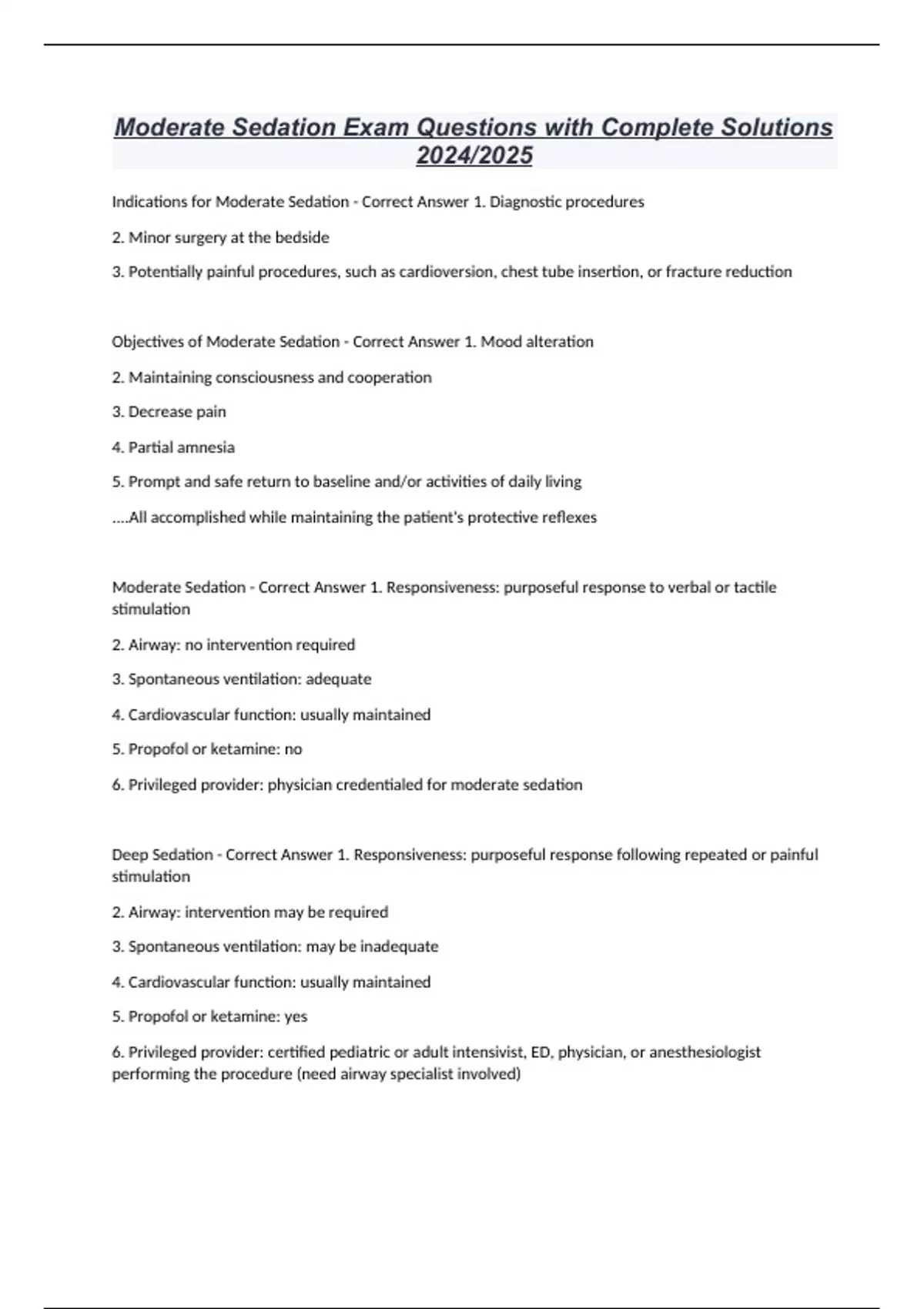Moderate Sedation Exam Questions with Complete Solutions 2024/2025 Indications for Moderate Sedation - Correct Answer 1. Diagnostic procedures 2. Minor surgery at the bedside 3. Potentially painful procedures, such as cardioversion, chest tube insertion, or fracture reduction Objectives of Moderate Sedation - Correct Answer 1. Mood alteration 2. Maintaining consciousness and cooperation 3. Decrease pain 4. Partial amnesia 5. Prompt and safe return to baseline and/or activities of daily living ....All accomplished while maintaining the patient's protective reflexes Moderate Sedation - Correct Answer 1. Responsiveness: purposeful response to verbal or tactile stimulation 2. Airway: no intervention required 3. Spontaneous ventilation: adequate 4. Cardiovascular function: usually maintained 5. Propofol or ketamine: no 6. Privileged provider: physician credentialed for moderate sedation Deep Sedation - Correct Answer 1. Responsiveness: purposeful response following repeated or painful stimulation 2. Airway: intervention may be required 3. Spontaneous ventilation: may be inadequate 4. Cardiovascular function: usually maintained 5. Propofol or ketamine: yes 6. Privileged provider: certified pediatric or adult intensivist, ED, physician, or anesthesiologist performing the procedure (need airway specialist involved)