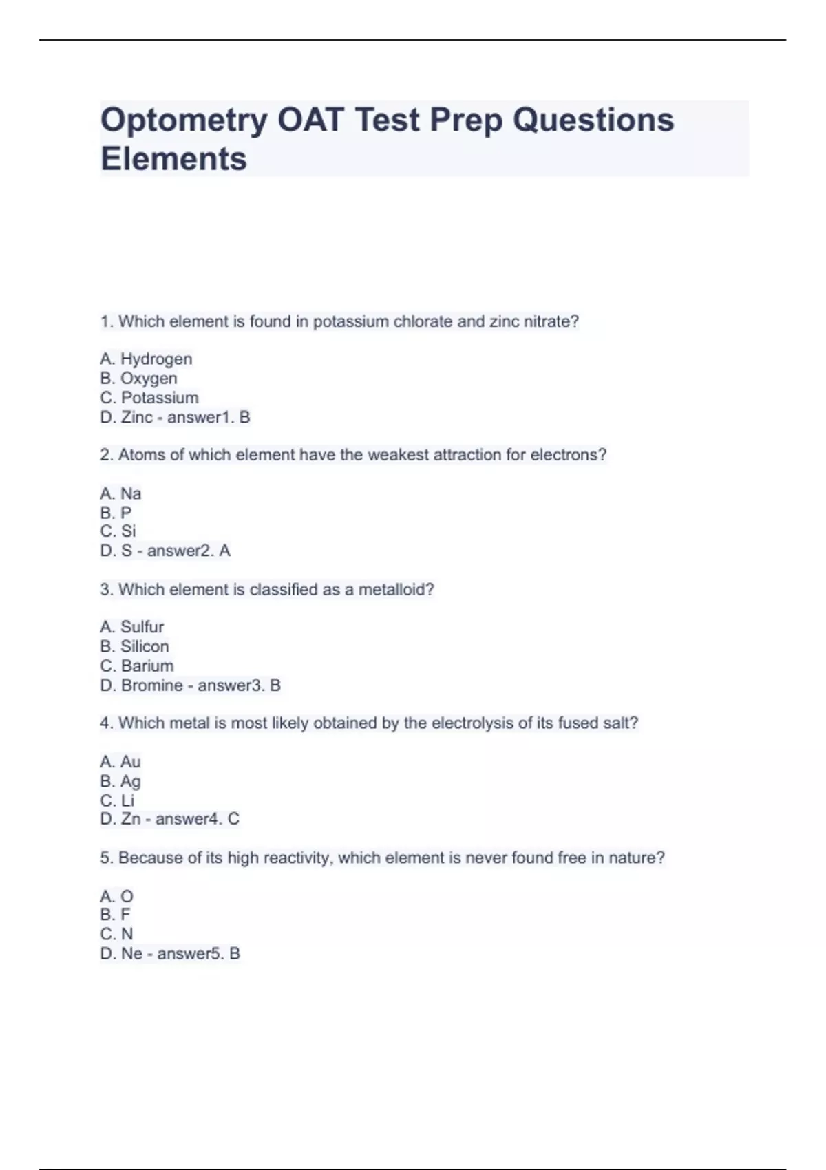 Optometry OAT Test Prep Questions Elements questions and answers Graded A+