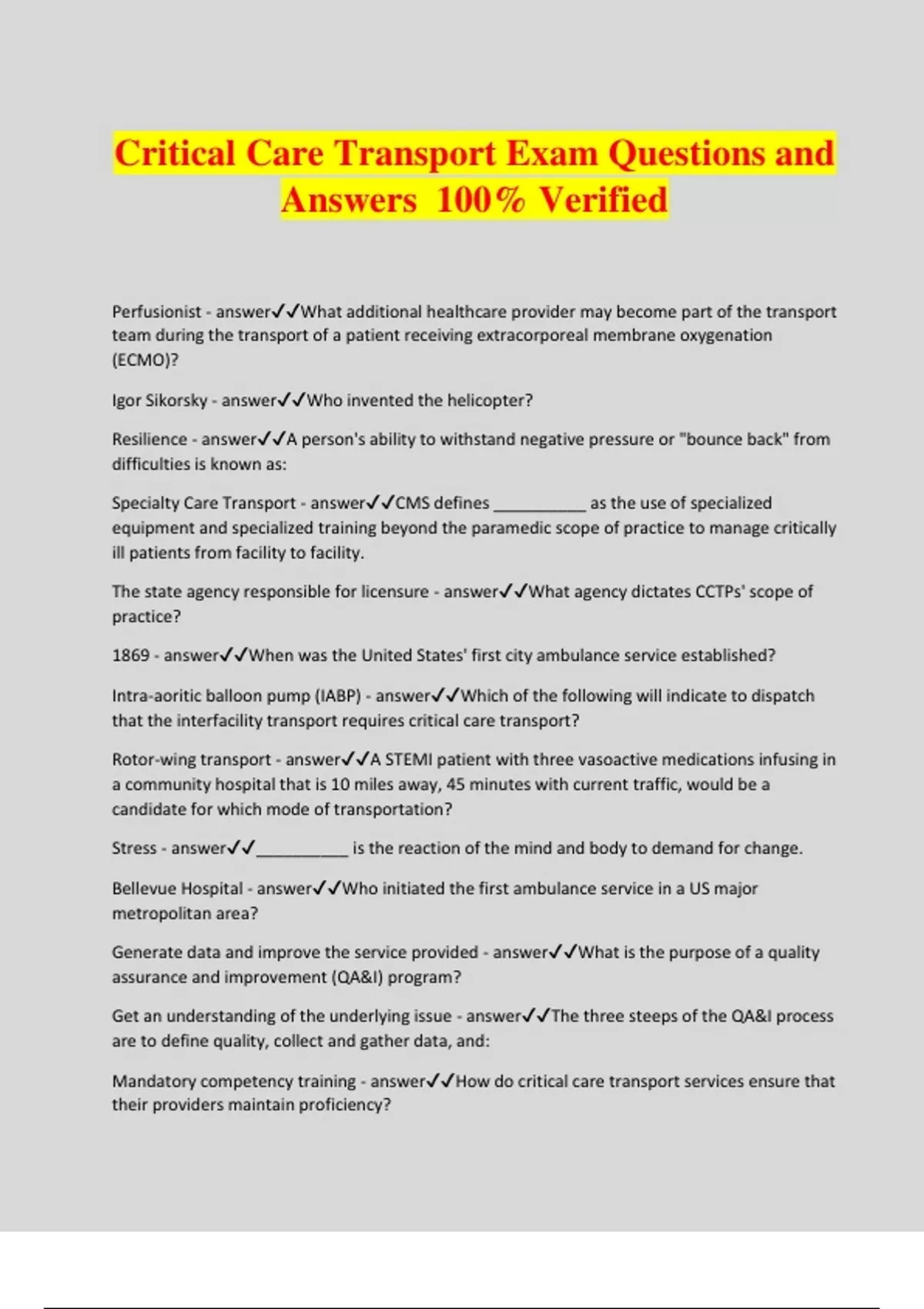 Critical Care Transport Exam Questions and Answers 100% Verified Perfusionist - answerWhat additional healthcare provider may become part of the transport team during the transport of a patient receiving extracorporeal membrane oxygenation (ECMO)? Igor Sikorsky - answerWho invented the helicopter? Resilience - answerA person's ability to withstand negative pressure or "bounce back" from difficulties is known as: Specialty Care Transport - answerCMS defines __________ as the use of specialized equipment and specialized training beyond the paramedic scope of practice to manage critically ill patients from facility to facility. The state agency responsible for licensure - answerWhat agency dictates CCTPs' scope of practice? 1869 - answerWhen was the United States' first city ambulance service established? Intra-aoritic balloon pump (IABP) - answerWhich of the following will indicate to dispatch that the interfacility transport requires critical care transport? Rotor-wing transport - answerA STEMI patient with three vasoactive medications infusing in a community hospital that is 10 miles away, 45 minutes with current traffic, would be a candidate for which mode of transportation? Stress - answer__________ is the reaction of the mind and body to demand for change. Bellevue Hospital - answerWho initiated the first ambulance service in a US major metropolitan area? Generate data and improve the service provided - answerWhat is the purpose of a quality assurance and improvement (QA&I) program? Get an understanding of the underlying issue - answerThe three steeps of the QA&I process are to define quality, collect and gather data, and: Mandatory competency training - answerHow do critical care transport services ensure that their providers maintain proficiency? Baltimore, Maryland - answerWhere did the first public services medevac program start? Fixed-wing transport - answerA 3-month old patient in Louisville, Kentucky, has a unique heart condition that requires an intervention that is currently only performed at the Children's Hospital of Philadelphia. What is the best mode of transportation for this patient? Benchmarking - answerProviding data from your transport system and participating in a database that compares it to other transport systems is: Hot air balloon - answerWhat vehicle was utilized in 1870 during the Prussian Siege of Paris as the first documented case of air medical transport? NCLEX-RN - answerWhat exam must candidates pass in order to obtain nursing licensure? Specialty Care Transport - answerWhich type of transport is the most expensive to operate? Two healthcare facilities - answerInterfacility transport is the transport of a patient between: Continuous monitoring and drugs of equipment required to sustain life - answerCritical care is the management of patients with life-threatening conditions that requires: The 11th century, during the Crusades - answerWhen was the movement of injured patients first recorded? Denver, Colorado - answerWhere was the first hospital-based air ambulance program developed? The dispatcher - answerWhat is the first point of contact for the rotor-wing critical care team? Arab and Greek Physicians - answerWho taught the Knights of St. John first aid procedures? Contact the receiving facilities physician - answerHow do you manage a patient when a sending physician refuses to allow you to treat a patient appropriately according to your protocols? Medical command physician orders - answerWhat is necessary for a CCTP to act outside of his or her protocols? Perform basic resuscitation, then seek clarification - answerDuring the hand-off report from the transferring nurse, he tells you that the patient has a DNR and only wants comfort measures performed. En-route, the patient codes but you are unable to find the patient's DNR in the chart. How do you manage the cardiac arrest? Laboratory and diagnostic tests - answer__________ may be disclosed for payment and insurance reasons. EMTALA - answerWhat guidelines determine the appropriate level of care for transportation? Receiving facility physician - answerIn preparation for transport, the sending facility physician must have identified and communicated with a __________ in order to initiate the patient transfer. The physician assistant - answerThe transferring neonatal orders a neonatal physician assistant to your transport team for the transfer of an 1,800-g neonate with an intraventricular hemorrhage and hydrocephalus. What dictates the management of the patient's care during this transport? The sending facility cannot perform the needed interventions - answerWhen is it acceptable to transfer an unstable patient from a facility? When a patient arrives on hospital property - answerWhen is a hospital bound by EMTALA regulations? Battery - answerWhat did you witness if you see a patient's spouse strike the patient's face with an open hand across the cheak? Patient rights - answerWhat allows individuals to accepts or refuse treatment, to receive appropriate care, and to receive care without interruption? The plaintiff - answerWho is responsible for the burden of proof in an negligence case filed against a CCTP? Obtain written orders to transport the medication infusion - answerHow do you manage the ground transport of a patient on an infusion unaddressed in your protocols but that you received education on during the recruit academy? Complete utilization of the facilities available resources - answerWhat must a transferring facility do in order to stabilize a patient prior to transport, according to EMTALA? Ask the physician to adjust the order or to send appropriate personnel - answerWhile reviewing the physician's written orders, you notice PRN interventions that exceed your scope of practice. How do you manage the transport? Informed consent - answerWhat type of consent is obtained after you discuss the treatment and transport plan with the patient and patient's family? Current diagnosis and interventions 