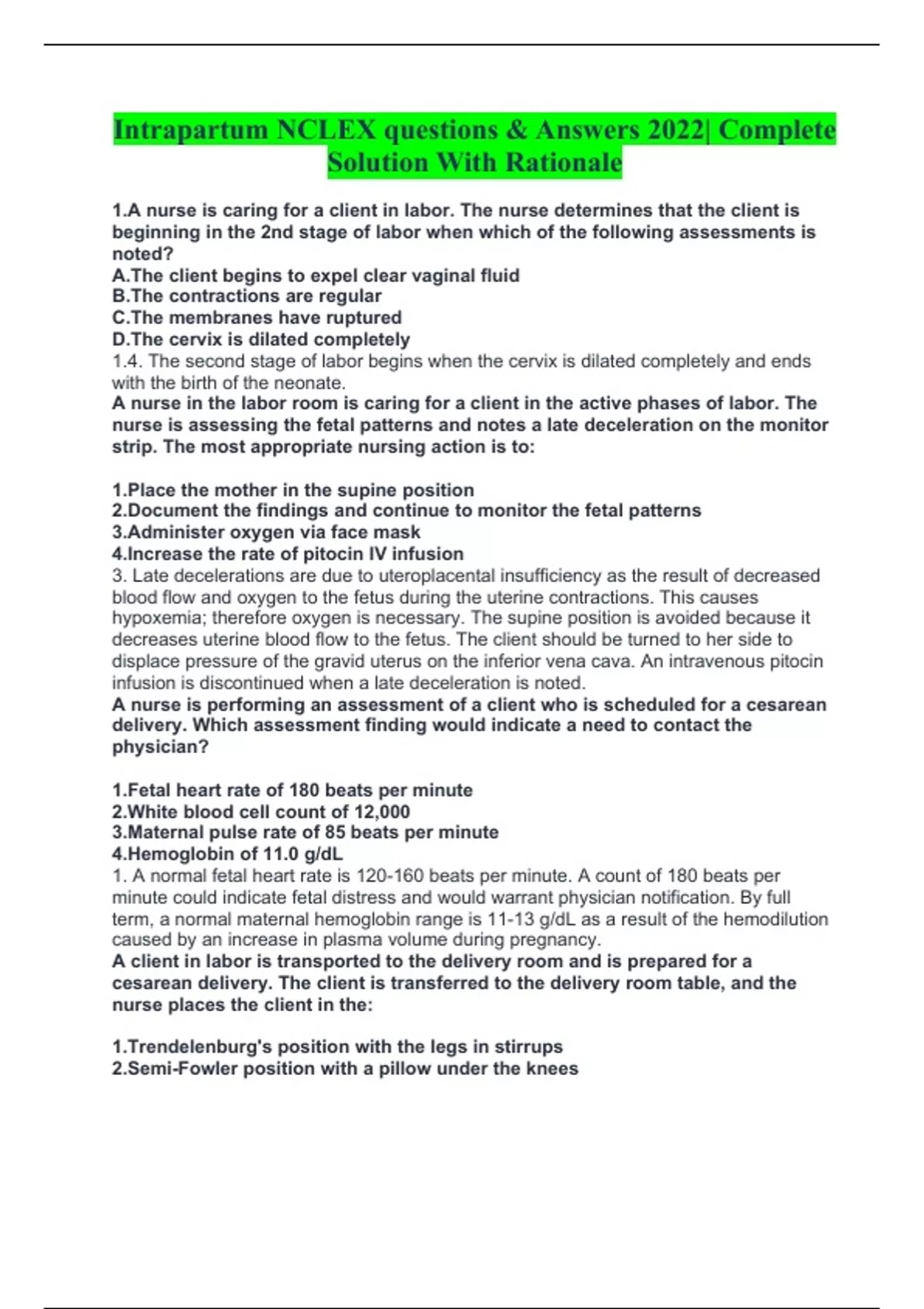 Intrapartum NCLEX questions & Answers 2022| Complete Solution With Rationale 1.A nurse is caring for a client in labor. The nurse determines that the client is beginning in the 2nd stage of labor when which of the following assessments is noted? A.The client begins to expel clear vaginal fluid B.The contractions are regular C.The membranes have ruptured D.The cervix is dilated completely 1.4. The second stage of labor begins when the cervix is dilated completely and ends with the birth of the neonate. A nurse in the labor room is caring for a client in the active phases of labor. The nurse is assessing the fetal patterns and notes a late deceleration on the monitor strip. The most appropriate nursing action is to: 1.Place the mother in the supine position 2.Document the findings and continue to monitor the fetal patterns 3.Administer oxygen via face mask 4.Increase the rate of pitocin IV infusion 3. Late decelerations are due to uteroplacental insufficiency as the result of decreased blood flow and oxygen to the fetus during the uterine contractions. This causes hypoxemia; therefore oxygen is necessary. The supine position is avoided because it decreases uterine blood flow to the fetus. The client should be turned to her side to displace pressure of the gravid uterus on the inferior vena cava. An intravenous pitocin infusion is discontinued when a late deceleration is noted. A nurse is performing an assessment of a client who is scheduled for a cesarean delivery. Which assessment finding would indicate a need to contact the physician? 1.Fetal heart rate of 180 beats per minute 2.White blood cell count of 12,000 3.Maternal pulse rate of 85 beats per minute 4.Hemoglobin of 11.0 g/dL 1. A normal fetal heart rate is 120-160 beats per minute. A count of 180 beats per minute could indicate fetal distress and would warrant physician notification. By full term, a normal maternal hemoglobin range is 11-13 g/dL as a result of the hemodilution caused by an increase in plasma volume during pregnancy. A client in labor is transported to the delivery room and is prepared for a cesarean delivery. The client is transferred to the delivery room table, and the nurse places the client in the: 1.Trendelenburg's position with the legs in stirrups 2.Semi-Fowler position with a pillow under the knees 3.Prone position with the legs separated and elevated 4.Supine position with a wedge under the right hip 4. Vena cava and descending aorta compression by the pregnant uterus impedes blood return from the lower trunk and extremities. This leads to decreasing cardiac return, cardiac output, and blood flow to the uterus and the fetus. The best position to prevent this would be side-lying with the uterus displaced off of abdominal vessels. Positioning for abdominal surgery necessitates a supine position; however, a wedge placed under the right hip provides displacement of the uterus. . A nurse is caring for a client in labor and prepares to auscultate the fetal heart rate by using a Doppler ultrasound device. The nurse most accurately determines that the fetal heart sounds are heard by: 1.Noting if the heart rate is greater than 140 BPM 2.Placing the diaphragm of the Doppler on the mother abdomen 3.Performing Leopold's maneuvers first to determine the location of the fetal heart 4.Palpating the maternal radial pulse while listening to the fetal heart rate 4. The nurse simultaneously should palpate the maternal radial or carotid pulse and auscultate the fetal heart rate to differentiate the two. If the fetal and maternal heart rates are similar, the nurse may mistake the maternal heart rate for the fetal heart rate. Leopold's maneuvers may help the examiner locate the position of the fetus but will not ensure a distinction between the two rates. A nurse is caring for a client in labor who is receiving Pitocin by IV infusion to stimulate uterine contractions. Which assessment finding would indicate to the nurse that the infusion needs to be discontinued? 1.Three contractions occurring within a 10-minute period 2.A fetal heart rate of 90 beats per minute 3.Adequate resting tone of the uterus palpated between contractions 4.Increased urinary output 2. A normal fetal heart rate is 120-160 BPM. Bradycardia or late or variable decelerations indicate fetal distress and the need to discontinue to pitocin. The goal of labor augmentation is to achieve three good-quality contractions in a 10-minute period. A nurse is beginning to care for a client in labor. The physician has prescribed an IV infusion of Pitocin. The nurse ensures that which of the following is implemented before initiating the infusion? 1.Placing the client on complete bed rest 2.Continuous electronic fetal monitoring 3.An IV infusion of antibiotics 4.Placing a code cart at the client's bedside 2. Continuous electronic fetal monitoring should be implemented during an IV infusion of Pitocin. A nurse is monitoring a client in active labor and notes that the client is having contractions every 3 minutes that last 45 seconds. The nurse notes that the fetal heart rate between contractions is 100 BPM. Which of the following nursing actions is most appropriate? 1.Encourage the client's coach to continue to encourage breathing exercises 2.Encourage the client to continue pushing with each contraction 3.Continue monitoring the fetal heart rate 4.Notify the physician or nurse mid-wife 4. A normal fetal heart rate is 120-160 beats per minute. Fetal bradycardia between contractions may indicate the need for immediate medical management, and the physician or nurse mid-wife needs to be notified. A nurse is caring for a client in labor and is monitoring the fetal heart rate patterns. The nurse notes the presence of episodic accelerations on the electronic fetal monitor tracing. Which of the following actions is most appropriate? 1.Document the findings and tell the mother that the monitor indicates fetal well-being 2.Take the mothers vital signs and tell the mother that bed res