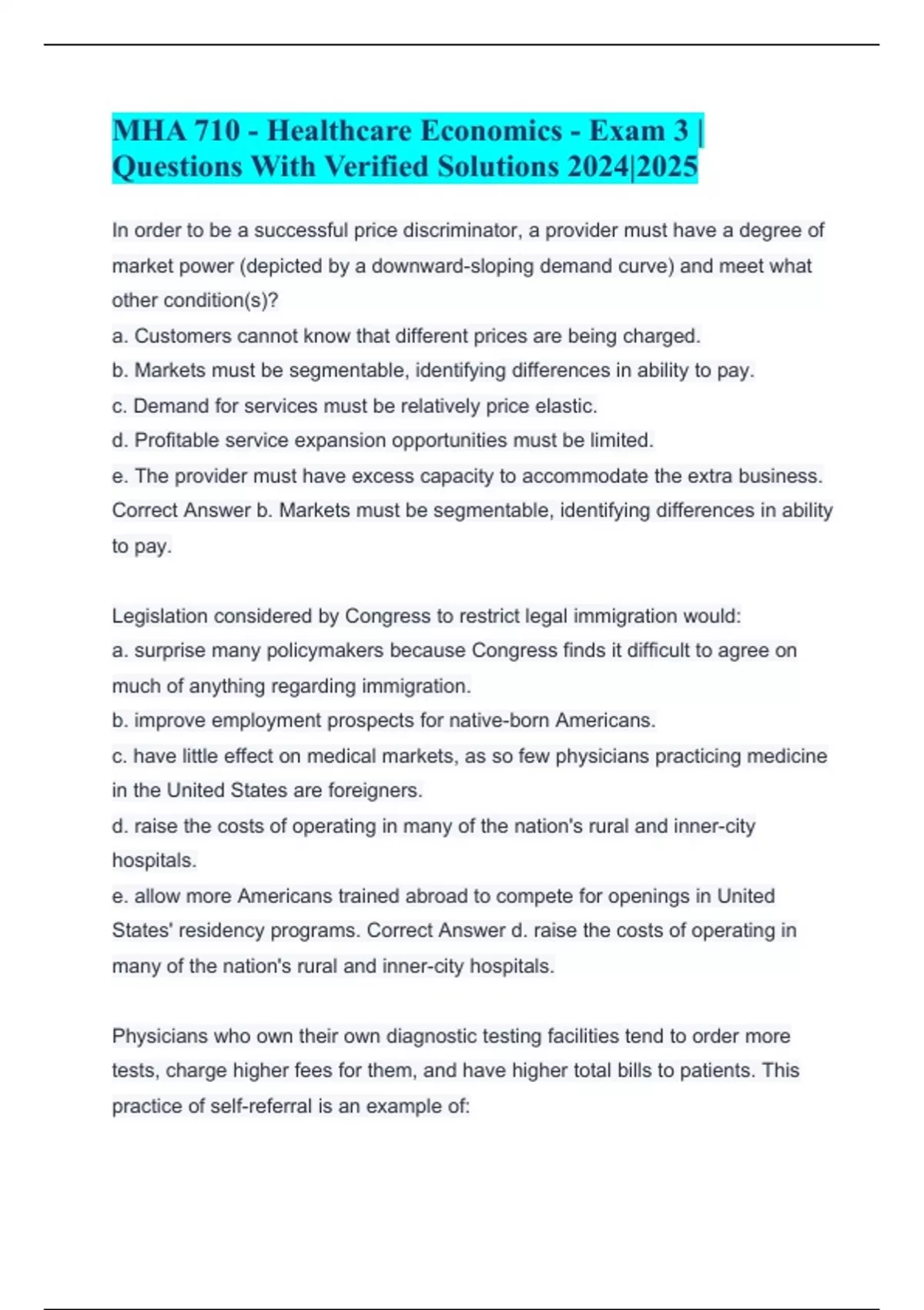 MHA 710 - Healthcare Economics - Exam 3 | Questions With Verified Solutions 2024|2025 In order to be a successful price discriminator, a provider must have a degree of market power (depicted by a downward-sloping demand curve) and meet what other condition(s)? a. Customers cannot know that different prices are being charged. b. Markets must be segmentable, identifying differences in ability to pay. c. Demand for services must be relatively price elastic. d. Profitable service expansion opportunities must be limited. e. The provider must have excess capacity to accommodate the extra business. Correct Answer b. Markets must be segmentable, identifying differences in ability to pay. Legislation considered by Congress to restrict legal immigration would: a. surprise many policymakers because Congress finds it difficult to agree on much of anything regarding immigration. b. improve employment prospects for native-born Americans. c. have little effect on medical markets, as so few physicians practicing medicine in the United States are foreigners. d. raise the costs of operating in many of the nation's rural and inner-city hospitals. e. allow more Americans trained abroad to compete for openings in United States' residency programs. Correct Answer d. raise the costs of operating in many of the nation's rural and inner-city hospitals. Physicians who own their own diagnostic testing facilities tend to order more tests, charge higher fees for them, and have higher total bills to patients. This practice of self-referral is an example of: a. cognitive dissonance. b. physician-induced demand. c. moral hazard. d. adverse selection. e. res ipsa loquitur. Correct Answer b. physician-induced demand. Which of the following statements is true concerning the trend in community hospital care between inpatient and outpatient services since the mid-1980s? a. Both inpatient and outpatient services have been declining. b. There has been no noticeable trend in either inpatient or outpatient services. c. Both inpatient and outpatient services have been growing. d. Outpatient services have been growing, while inpatient services have been declining. e. Outpatient services have been declining, while inpatient services have been growing. Correct Answer d. Outpatient services have been growing, while inpatient services have been declining.