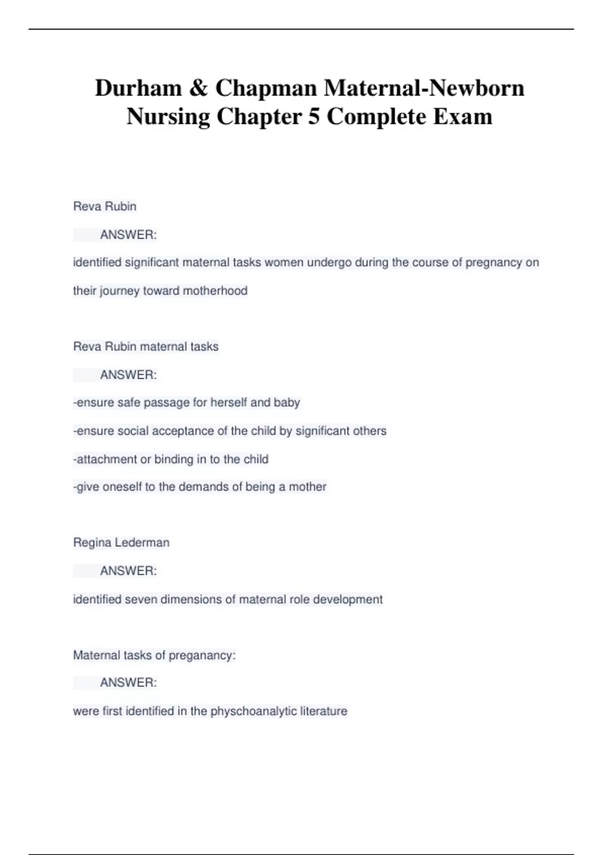 Durham & Chapman Maternal-Newborn Nursing Chapter 5 Complete Exam