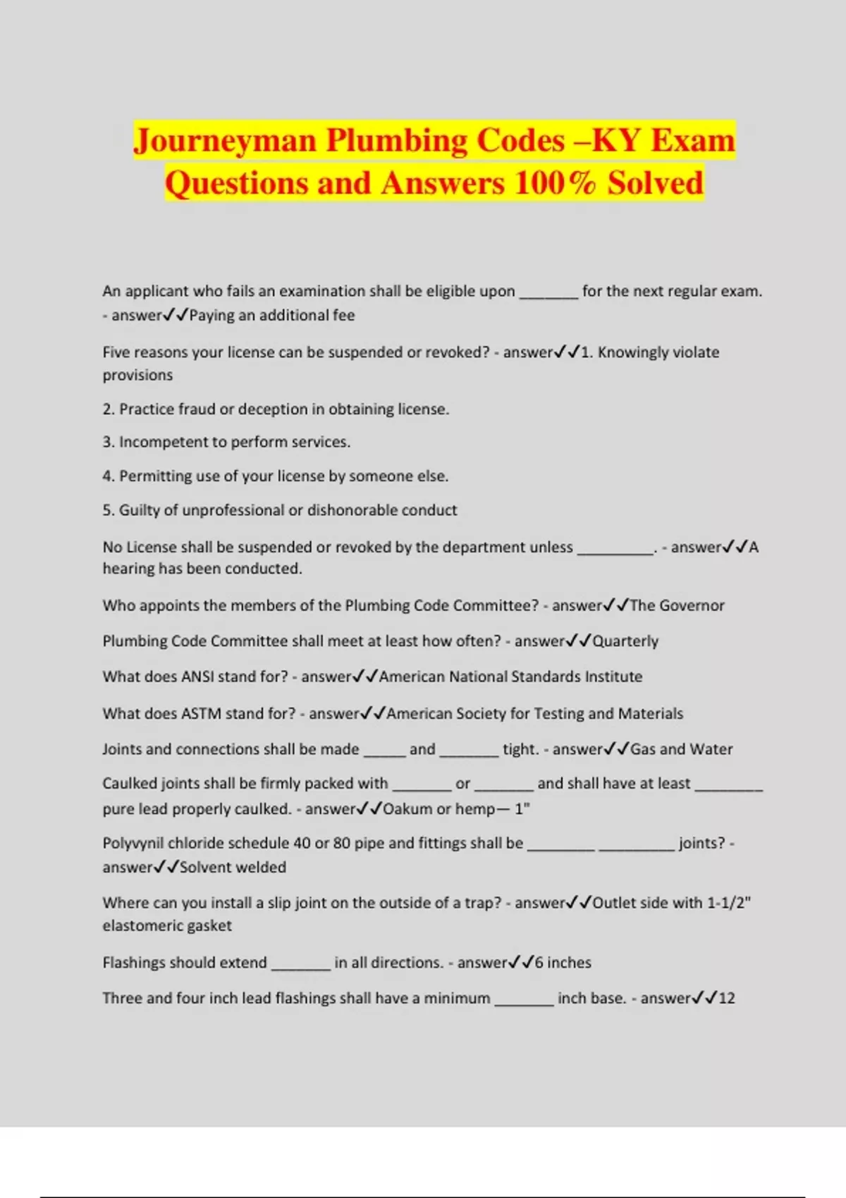 Journeyman Plumbing Codes –KY Exam Questions and Answers 100% Solved An applicant who fails an examination shall be eligible upon _______ for the next regular exam. - answerPaying an additional fee Five reasons your license can be suspended or revoked? - answer1. Knowingly violate provisions 2. Practice fraud or deception in obtaining license. 3. Incompetent to perform services. 4. Permitting use of your license by someone else. 5. Guilty of unprofessional or dishonorable conduct No License shall be suspended or revoked by the department unless _________. - answerA hearing has been conducted. Who appoints the members of the Plumbing Code Committee? - answerThe Governor Plumbing Code Committee shall meet at least how often? - answerQuarterly What does ANSI stand for? - answerAmerican National Standards Institute What does ASTM stand for? - answerAmerican Society for Testing and Materials Joints and connections shall be made _____ and _______ tight. - answerGas and Water Caulked joints shall be firmly packed with _______ or _______ and shall have at least ________ pure lead properly caulked. - answerOakum or hemp— 1" Polyvynil chloride schedule 40 or 80 pipe and fittings shall be ________ _________ joints? - answerSolvent welded Where can you install a slip joint on the outside of a trap? - answerOutlet side with 1-1/2" elastomeric gasket Flashings should extend _______ in all directions. - answer6 inches Three and four inch lead flashings shall have a minimum _______ inch base. - answer12
