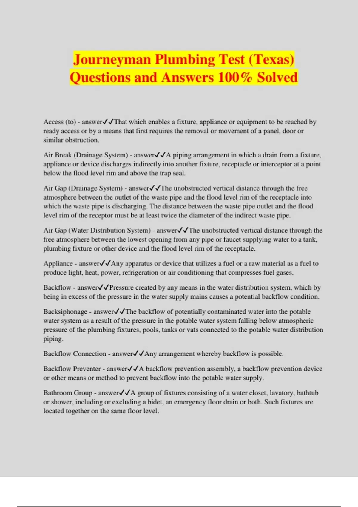 Journeyman Plumbing Test (Texas) Questions and Answers 100% Solved Access (to) - answerThat which enables a fixture, appliance or equipment to be reached by ready access or by a means that first requires the removal or movement of a panel, door or similar obstruction. Air Break (Drainage System) - answerA piping arrangement in which a drain from a fixture, appliance or device discharges indirectly into another fixture, receptacle or interceptor at a point below the flood level rim and above the trap seal. Air Gap (Drainage System) - answerThe unobstructed vertical distance through the free atmosphere between the outlet of the waste pipe and the flood level rim of the receptacle into which the waste pipe is discharging. The distance between the waste pipe outlet and the flood level rim of the receptor must be at least twice the diameter of the indirect waste pipe. Air Gap (Water Distribution System) - answerThe unobstructed vertical distance through the free atmosphere between the lowest opening from any pipe or faucet supplying water to a tank, plumbing fixture or other device and the flood level rim of the receptacle. Appliance - answerAny apparatus or device that utilizes a fuel or a raw material as a fuel to produce light, heat, power, refrigeration or air conditioning that compresses fuel gases. Backflow - answerPressure created by any means in the water distribution system, which by being in excess of the pressure in the water supply mains causes a potential backflow condition. Backsiphonage - answerThe backflow of potentially contaminated water into the potable water system as a result of the pressure in the potable water system falling below atmospheric pressure of the plumbing fixtures, pools, tanks or vats connected to the potable water distribution piping. Backflow Connection - answerAny arrangement whereby backflow is possible. Backflow Preventer - answerA backflow prevention assembly, a backflow prevention device or other means or method to prevent backflow into the potable water supply. Bathroom Group - answerA group of fixtures consisting of a water closet, lavatory, bathtub or shower, including or excluding a bidet, an emergency floor drain or both. Such fixtures are located together on the same floor level. Branch Interval - answerA vertical measurement of distance, 8 feet (2438 mm) or more in developed length, between the connections of horizontal branches to a drainage stack. Measurements are taken down the stack from the highest horizontal branch connection. Branch Vent - answerA vent connecting one or more individual vents with a vent stack or stack vent. Building Drain - answerThat part of the lowest piping of a drainage system that receives the discharge from soil, waste and other drainage pipes inside and that extends 30 inches (762 mm) in developed length of pipe beyond the exterior walls of the building and conveys the drainage to the building sewer. Code - answerThese regulations, subsequent amendments thereto or any emergency rules or regulations that the administrative authority having jurisdiction has lawfully adopted Combination Waste and Vent System - answerA specially designed system of waste piping embodying the horizontal wet venting of one or more sinks, lavatories, drinking fountains or floor drains by means of a common waste and vent pipe adequately sized to provide free movement of air above the flow line of the drain. Pipe Material / Max Horizontal Bracing / Max Vertical Bracing - answerABS / 4ft / 10ft Cast-Iron / 5ft / 15ft Copper Tubing (1 1/4 or smaller) / 6ft / 10ft Copper Tubing (1 1/2 or larger) / 10ft / 10ft PEX / 32in / 10ft PVC / 4ft / 10ft Common Vent - answerA vent connecting at the junction of two fixture drains or to a fixture branch and serving as a vent for both fixtures. Conductor - answerA pipe inside the building that conveys stormwater from the roof to a storm or combined building drain. Contamination - answerAn impairment of the quality of the potable water that creates an actual hazard to the public health through poisoning or the spread of disease by sewage, industrial fluids or waste. Cross Contamination - answerAny physical connection or arrangement between two otherwise separate piping systems, one of which contains portable water and the other, either water of unknown or questionable safety or stream, gas or chemical, whereby their exists the possibility for flow from one system to the other, with the direction of flow depending on the pressure differential between the two systems ("Backflow").