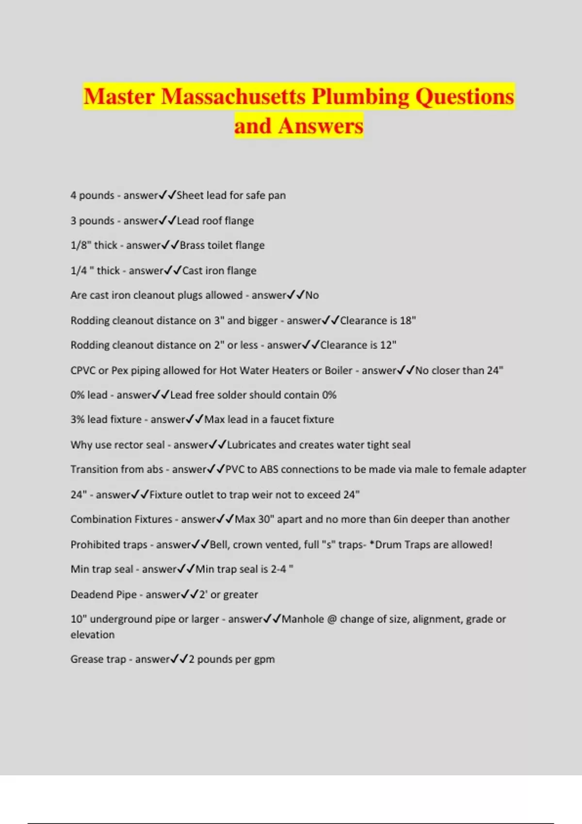 Master Massachusetts Plumbing Questions and Answers 4 pounds - answerSheet lead for safe pan 3 pounds - answerLead roof flange 1/8" thick - answerBrass toilet flange 1/4 " thick - answerCast iron flange Are cast iron cleanout plugs allowed - answerNo Rodding cleanout distance on 3" and bigger - answerClearance is 18" Rodding cleanout distance on 2" or less - answerClearance is 12" CPVC or Pex piping allowed for Hot Water Heaters or Boiler - answerNo closer than 24" 0% lead - answerLead free solder should contain 0% 3% lead fixture - answerMax lead in a faucet fixture Why use rector seal - answerLubricates and creates water tight seal Transition from abs - answerPVC to ABS connections to be made via male to female adapter 24" - answerFixture outlet to trap weir not to exceed 24" Combination Fixtures - answerMax 30" apart and no more than 6in deeper than another Prohibited traps - answerBell, crown vented, full "s" traps- *Drum Traps are allowed! Min trap seal - answerMin trap seal is 2-4 " Deadend Pipe - answer2' or greater 10" underground pipe or larger - answerManhole @ change of size, alignment, grade or elevation Grease trap - answer2 pounds per gpm Commercial Laundry - answerCommercial Laundry drain must handle 75% of total washing machines Shower Stall - answer900 Sq in or 30 measured as the side of a rectangle (interior dimensions). Shower Pans - answerShower Pans must be turned up on all sides at least above the threashold Shower temperature - answerShower head not exceed 110 or 112 Trapping commercial food grinder - answerCommercial food waste grinder trapped separately Washing Machine standpipe - answerWashing machine stand pipe min is 30" above the base of machine and 18-30" above trap and discharge through an air break Sacrium - answerSacrium drains in a dry well 1 DFU - answerEquals 7.5 GPM Back water valve - answerBack water valve on outlet pipe on ejector Minimum GPM on Residential Ejector Pump - answerResidential Ejector Pump minimum is 20 GPM Sanitary Tee - answerNo longer called an Esterbrook No trap required - answerNo traps required on indirect waste main or branch main Special Hazardous Waste - answerSpecial Hazardous Wastes are marked yellow and are 25 feet apart Max Hot Water - answerResidential hot water 130 degree max temp Max temp into drainage system - answerMax temp is 150 degree allowed into drainage system Mechanical Pressure Absorbers - answerLocated at the end of long runs of water pipe Saddle valves - answerProhibited on water and drainage lines Sillcock psi - answerMinimum PSI at sillcock 10 psi and 5 gpm Residential PSI - answerPressure greater than 80 psi in a house requires a pressure reducing valve Safe water - answer3" in diameter tag with letters, 1/2 " height marked every 25'