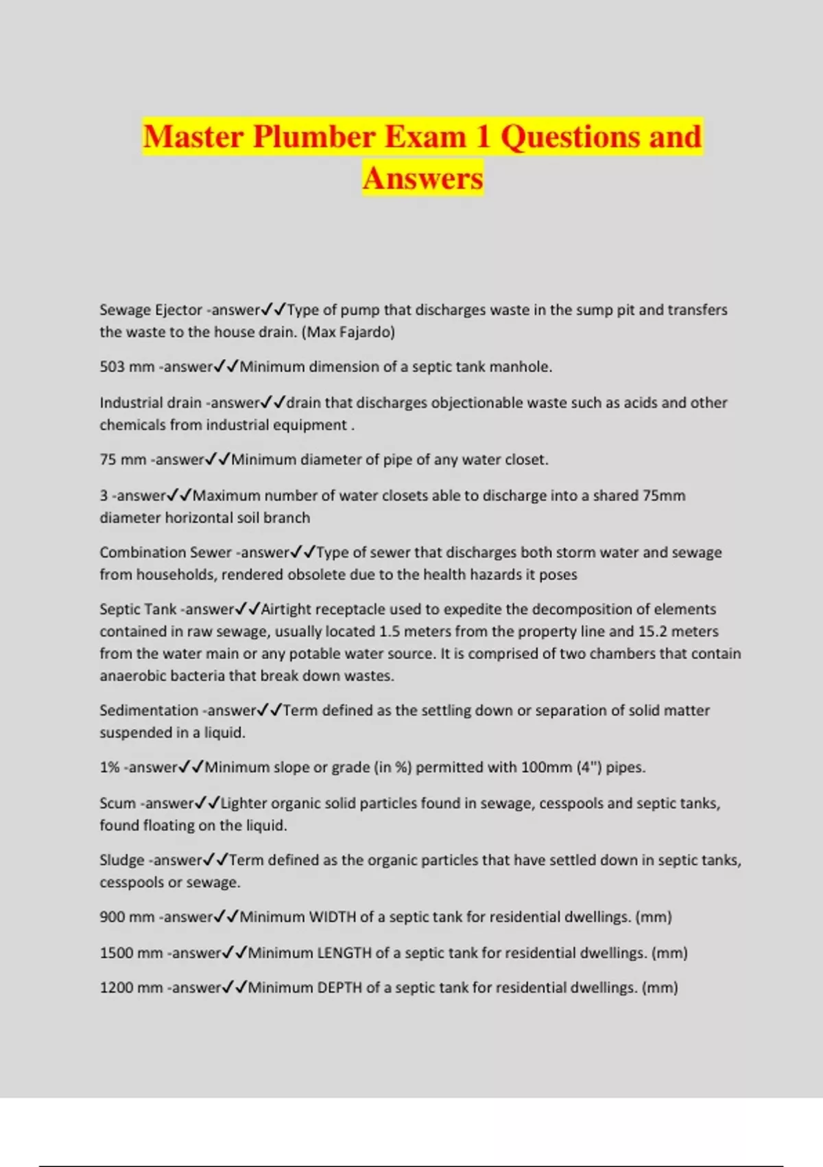 master plumber exam 1 questions and answers