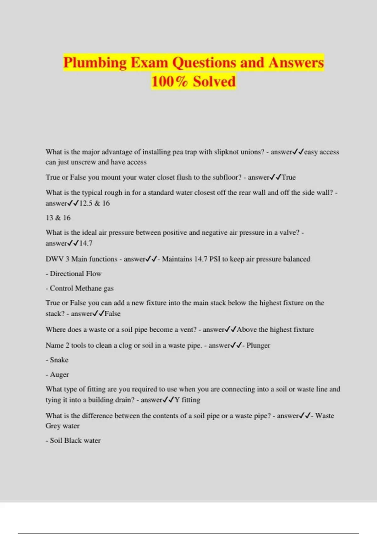 Plumbing Exam Questions and Answers 100% Solved What is the major advantage of installing pea trap with slipknot unions? - answereasy access can just unscrew and have access True or False you mount your water closet flush to the subfloor? - answerTrue What is the typical rough in for a standard water closest off the rear wall and off the side wall? - answer12.5 & 16 13 & 16 What is the ideal air pressure between positive and negative air pressure in a valve? - answer14.7 DWV 3 Main functions - answer- Maintains 14.7 PSI to keep air pressure balanced - Directional Flow - Control Methane gas True or False you can add a new fixture into the main stack below the highest fixture on the stack? - answerFalse Where does a waste or a soil pipe become a vent? - answerAbove the highest fixture Name 2 tools to clean a clog or soil in a waste pipe. - answer- Plunger - Snake - Auger What type of fitting are you required to use when you are connecting into a soil or waste line and tying it into a building drain? - answerY fitting What is the difference between the contents of a soil pipe or a waste pipe? - answer- Waste Grey water - Soil Black water