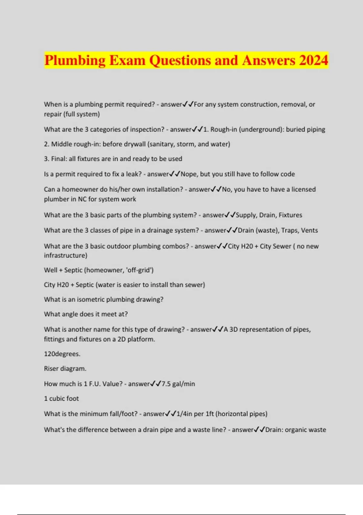 Plumbing Exam Questions and Answers 2024 When is a plumbing permit required? - answerFor any system construction, removal, or repair (full system) What are the 3 categories of inspection? - answer1. Rough-in (underground): buried piping 2. Middle rough-in: before drywall (sanitary, storm, and water) 3. Final: all fixtures are in and ready to be used Is a permit required to fix a leak? - answerNope, but you still have to follow code Can a homeowner do his/her own installation? - answerNo, you have to have a licensed plumber in NC for system work What are the 3 basic parts of the plumbing system? - answerSupply, Drain, Fixtures What are the 3 classes of pipe in a drainage system? - answerDrain (waste), Traps, Vents What are the 3 basic outdoor plumbing combos? - answerCity H20 + City Sewer ( no new infrastructure) Well + Septic (homeowner, 'off-grid') City H20 + Septic (water is easier to install than sewer) What is an isometric plumbing drawing? What angle does it meet at? What is another name for this type of drawing? - answerA 3D representation of pipes, fittings and fixtures on a 2D platform. 120degrees. Riser diagram. How much is 1 F.U. Value? - answer7.5 gal/min 1 cubic foot What is the minimum fall/foot? - answer1/4in per 1ft (horizontal pipes) What's the difference between a drain pipe and a waste line? - answerDrain: organic waste