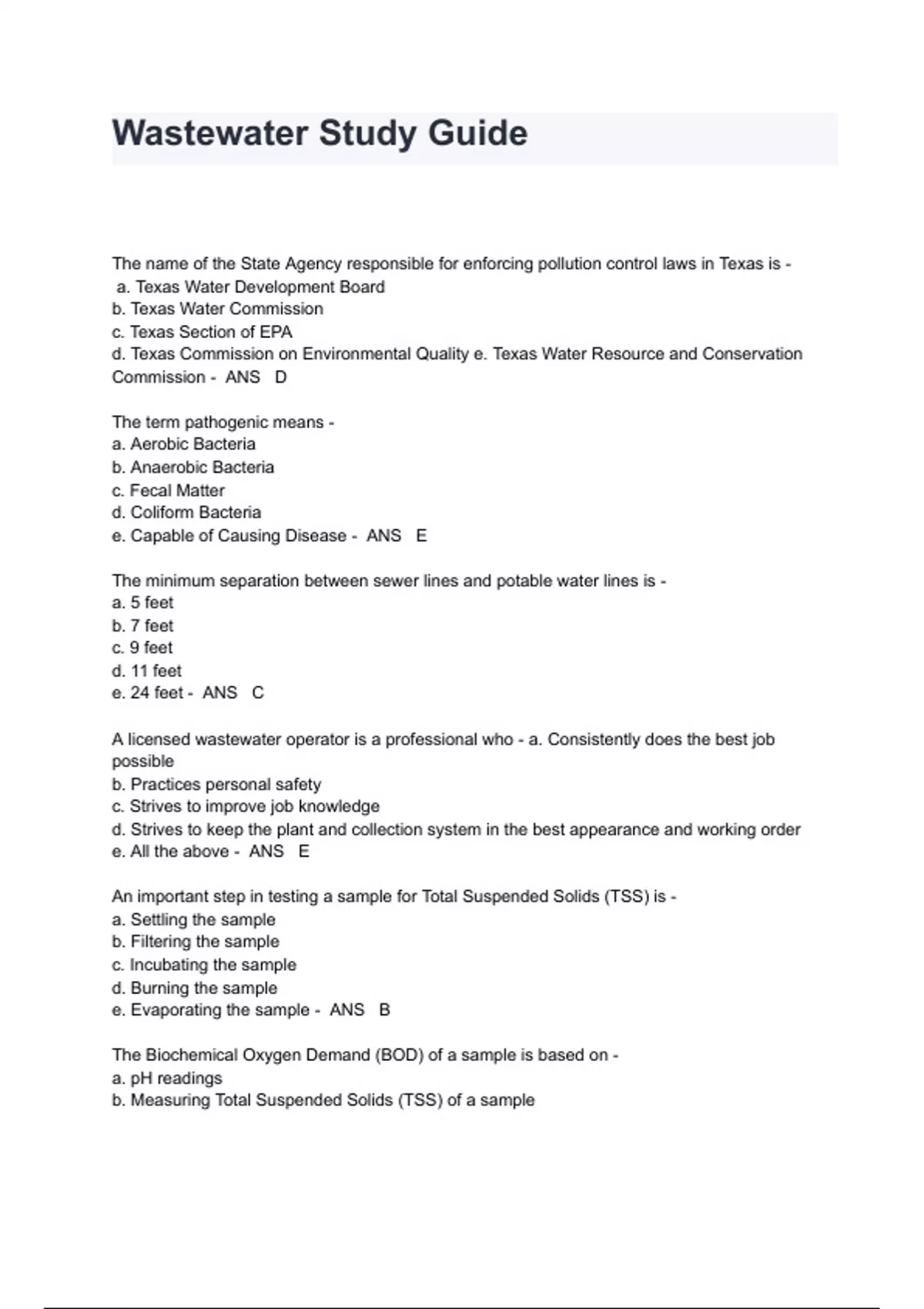 Wastewater Study Guide Exam Questions And Answers The name of the State Agency responsible for enforcing pollution control laws in Texas is - a. Texas Water Development Board b. Texas Water Commission c. Texas Section of EPA d. Texas Commission on Environmental Quality e. Texas Water Resource and Conservation Commission - ANS D The term pathogenic means - a. Aerobic Bacteria b. Anaerobic Bacteria c. Fecal Matter d. Coliform Bacteria e. Capable of Causing Disease - ANS E The minimum separation between sewer lines and potable water lines is - a. 5 feet b. 7 feet c. 9 feet d. 11 feet e. 24 feet - ANS C A licensed wastewater operator is a professional who - a. Consistently does the best job possible b. Practices personal safety c. Strives to improve job knowledge d. Strives to keep the plant and collection system in the best appearance and working order e. All the above - ANS E An important step in testing a sample for Total Suspended Solids (TSS) is - a. Settling the sample b. Filtering the sample c. Incubating the sample d. Burning the sample e. Evaporating the sample - ANS B The Biochemical Oxygen Demand (BOD) of a sample is based on - a. pH readings b. Measuring Total Suspended Solids (TSS) of a sample