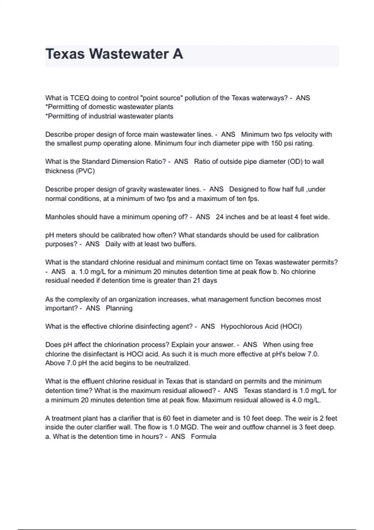 Texas Wastewater A Exam Questions And Answers All Verified What is TCEQ doing to control "point source" pollution of the Texas waterways? - ANS *Permitting of domestic wastewater plants *Permitting of industrial wastewater plants Describe proper design of force main wastewater lines. - ANS Minimum two fps velocity with the smallest pump operating alone. Minimum four inch diameter pipe with 150 psi rating. What is the Standard Dimension Ratio? - ANS Ratio of outside pipe diameter (OD) to wall thickness (PVC) Describe proper design of gravity wastewater lines. - ANS Designed to flow half full ,under normal conditions, at a minimum of two fps and a maximum of ten fps. Manholes should have a minimum opening of? - ANS 24 inches and be at least 4 feet wide. pH meters should be calibrated how often? What standards should be used for calibration purposes? - ANS Daily with at least two buffers. What is the standard chlorine residual and minimum contact time on Texas wastewater permits? - ANS a. 1.0 mg/L for a minimum 20 minutes detention time at peak flow b. No chlorine residual needed if detention time is greater than 21 days As the complexity of an organization increases, what management function becomes most important? - ANS Planning What is the effective chlorine disinfecting agent? - ANS Hypochlorous Acid (HOCl) Does pH affect the chlorination process? Explain your answer. - ANS When using free chlorine the disinfectant is HOCl acid. As such it is much more effective at pH's below 7.0. Above 7.0 pH the acid begins to be neutralized. What is the effluent chlorine residual in Texas that is standard on permits and the minimum detention time? What is the maximum residual allowed? - ANS Texas standard is 1.0 mg/L for a minimum 20 minutes detention time at peak flow. Maximum residual allowed is 4.0 mg/L. A treatment plant has a clarifier that is 60 feet in diameter and is 10 feet deep. The weir is 2 feet inside the outer clarifier wall. The flow is 1.0 MGD. The weir and outflow channel is 3 feet deep. a. What is the detention time in hours? - ANS Formula