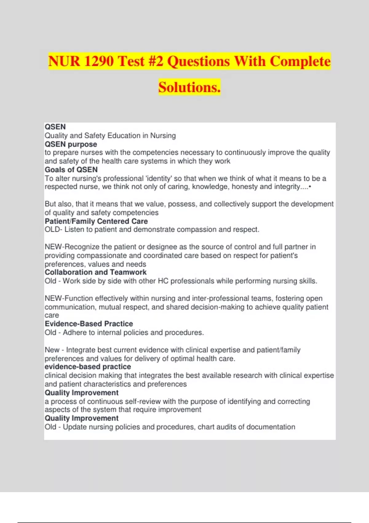 NUR 1290 Test #2 Questions With Complete Solutions. QSEN Quality and Safety Education in Nursing QSEN purpose to prepare nurses with the competencies necessary to continuously improve the quality and safety of the health care systems in which they work Goals of QSEN To alter nursing's professional 'identity' so that when we think of what it means to be a respected nurse, we think not only of caring, knowledge, honesty and integrity....• But also, that it means that we value, possess, and collectively support the development of quality and safety competencies Patient/Family Centered Care OLD- Listen to patient and demonstrate compassion and respect. NEW-Recognize the patient or designee as the source of control and full partner in providing compassionate and coordinated care based on respect for patient's preferences, values and needs Collaboration and Teamwork Old - Work side by side with other HC professionals while performing nursing skills. NEW-Function effectively within nursing and inter-professional teams, fostering open communication, mutual respect, and shared decision-making to achieve quality patient care Evidence-Based Practice Old - Adhere to internal policies and procedures. New - Integrate best current evidence with clinical expertise and patient/family preferences and values for delivery of optimal health care. evidence-based practice clinical decision making that integrates the best available research with clinical expertise and patient characteristics and preferences Quality Improvement a process of continuous self-review with the purpose of identifying and correcting aspects of the system that require improvement Quality Improvement Old - Update nursing policies and procedures, chart audits of documentation