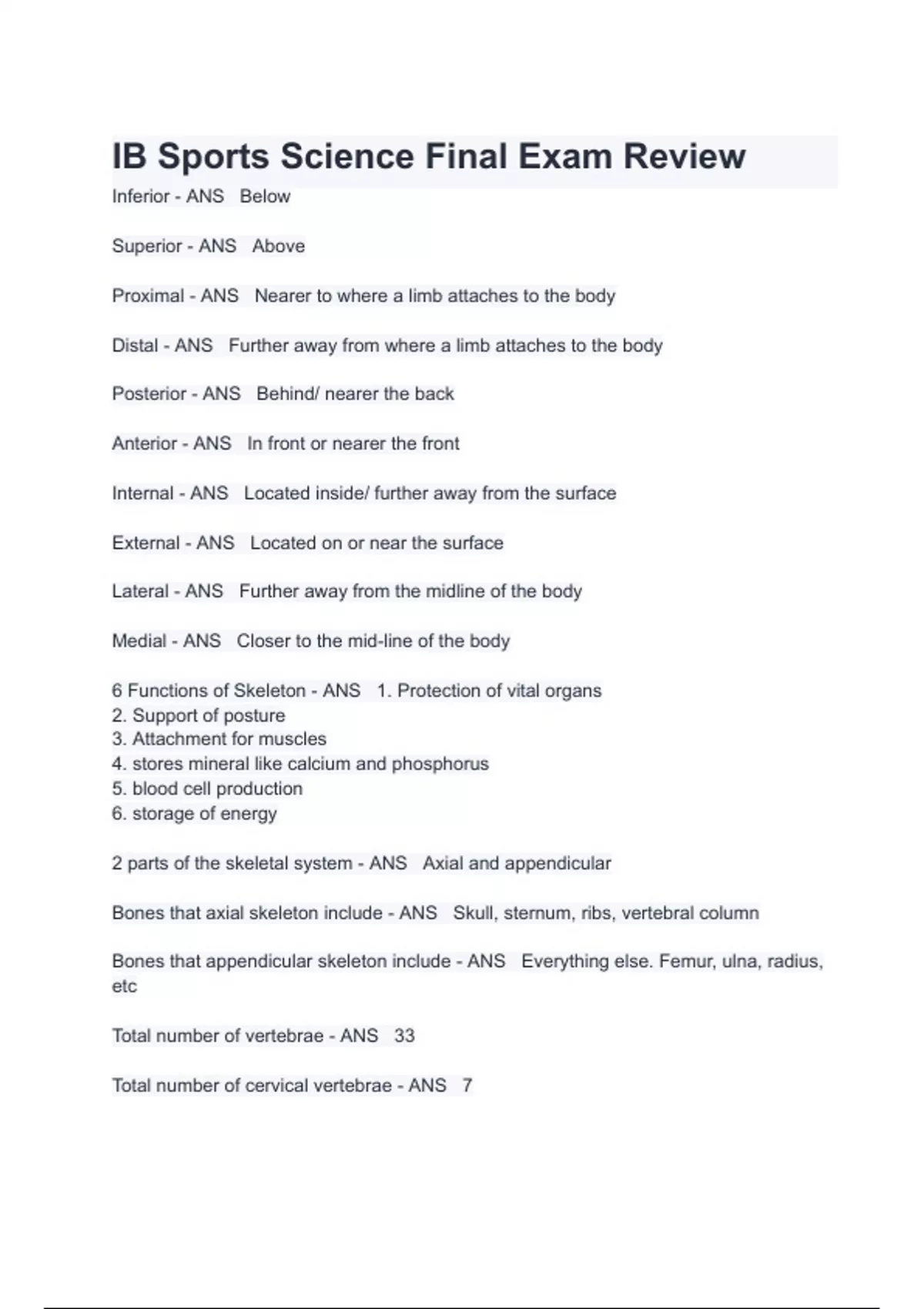 Inferior - ANS Below Superior - ANS Above Proximal - ANS Nearer to where a limb attaches to the body Distal - ANS Further away from where a limb attaches to the body Posterior - ANS Behind/ nearer the back Anterior - ANS In front or nearer the front Internal - ANS Located inside/ further away from the surface External - ANS Located on or near the surface Lateral - ANS Further away from the midline of the body Medial - ANS Closer to the mid-line of the body 6 Functions of Skeleton - ANS 1. Protection of vital organs 2. Support of posture 3. Attachment for muscles 4. stores mineral like calcium and phosphorus 5. blood cell production 6. storage of energy 2 parts of the skeletal system - ANS Axial and appendicular Bones that axial skeleton include - ANS Skull, sternum, ribs, vertebral column Bones that appendicular skeleton include - ANS Everything else. Femur, ulna, radius, etc Total number of vertebrae - ANS 33 Total number of cervical vertebrae - ANS 7 Cervical vertebrae is located - ANS at the very top Total number of thoractic vertebrae - ANS 12 Thoractic vertebrae is located - ANS below the cervical vert. Total number of lumbar vertebrae - ANS 5 Location of lumbar vertebrae - ANS below thoractic. 3rd Total number of sacral vertebrae - ANS 5 Location of sacral vertebrae - ANS Below lumbar Total number of coccygeal vertebrae - ANS 4 Location of coccygeal vertebrae - ANS At very botton below the sacral Order of vertebrae - ANS Cervical, thoractic, lumbar, sacral, coccygeal Located between each vertebrae is - ANS an intervertebral disk Total number of PAIRS of ribs - ANS 12 True ribs - ANS First 7 ribs False ribs - ANS ribs 8, 9, and 10 Floating ribs - ANS Ribs 11 and 12 Long bones - ANS Enlarged at both ends Long bone example - ANS femur, metatarsals Short bones - ANS Small and cube shaped Examples of short bones - ANS Carpals and tarsals Flat bones - ANS Curved surfaces that provide tension Examples of flat bones - ANS Sternum, scapula, ribs, and pelvis Irregular bones - ANS Irregular shapes Examples of irregular bones - ANS vertebrae Top of a long bone name - ANS Proximal epiphysis Middle of a long bone name - ANS Diaphysis Bottom of a long bone name - ANS Distal epiphysis Outer layer of bone name - ANS Periosteum Red marrow storage is located - ANS in spongy bone Yellow marrow is located in - ANS the Diaphysis Types of joints - ANS Fibrous joints Cartilaginous joints Synovial joints Fibrous joints definition - ANS thin layer of fibrous tissue. no movement is allowed Fibrous joints example - ANS Between the sutures in the skull Cartilaginous joints definition - ANS Bones separated by a fibrocartilage disc or a thick layer of hyaline cartilage Example of Cartilaginous joints - ANS Connecting sternum to ribs Synovial joints - ANS They have space between the joints, Cartalidge attaches joints, articular capsule surrounds the joint, etc. Most common type of joint