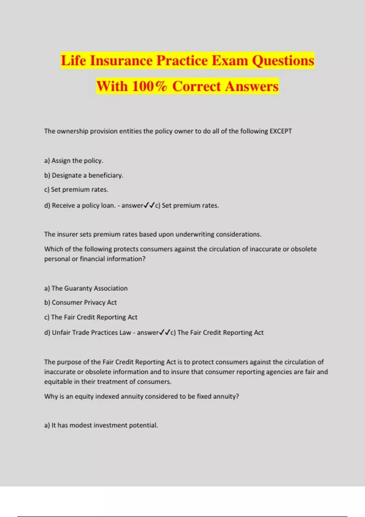 Life Insurance Practice Exam Questions With 100% Correct Answers The ownership provision entities the policy owner to do all of the following EXCEPT a) Assign the policy. b) Designate a beneficiary. c) Set premium rates. d) Receive a policy loan. - answerc) Set premium rates. The insurer sets premium rates based upon underwriting considerations. Which of the following protects consumers against the circulation of inaccurate or obsolete personal or financial information? a) The Guaranty Association b) Consumer Privacy Act c) The Fair Credit Reporting Act d) Unfair Trade Practices Law - answerc) The Fair Credit Reporting Act The purpose of the Fair Credit Reporting Act is to protect consumers against the circulation of inaccurate or obsolete information and to insure that consumer reporting agencies are fair and equitable in their treatment of consumers. Why is an equity indexed annuity considered to be fixed annuity? a) It has modest investment potential. b) It has a fixed rate of return. c) It is not tied to an index like the S&P 500. d) It has a guaranteed minimum interest rate. - answerd) It has a guaranteed minimum interest rate. While equity indexed annuities earn higher interest rates than fixed annuities, both types of annuities guarantee a specific minimum interest rate. An agent who is a resident of another state may obtain an Oklahoma nonresident license without taking a licensing examination provided a) The agent is currently licensed in the state of domicile. b) The agent obtained that license by passing a test suitable to the Oklahoma Department. c) The state where the agent lives affords the same privilege to residents of Oklahoma. d) All of these requirements are met. - answerd) All of these requirements are met. A nonresident can be licensed as an insurance agent in the Oklahoma licensing requirements are met, as long as the agents home state gives Oklahoma residents the same privilege (reciprocity). The applicant must hold a license in good standing in his or her resident state. Which nonforfeiture option has the highest amount of insurance protection? a) Decreasing Term b) Reduced Paid-up c) Extended Term d) Conversion - answerc) Extended Term The Extended Term nonforfeiture option has the same face amount as the original policy, but for a shorter period of time. What is a material misrepresentation? a) Any misstatement made by an applicant for insurance b) Any misstatement by the producer c) Concealment d) A statement by the applicant that, upon discovery, would affect the underwriting decision of the insurance company - answerd) A statement by the applicant that, upon discovery, would affect the underwriting decision of the insurance company A material misrepresentation is a statement that, if discovered, would alter the underwriting decision of the insurance company. Which of the following information about the applicant is NOT included in the General Information section of the application for insurance? a) Occupation b) Marital status c) Medical background d) Gender - answerc) Medical background Part 1 - General Information of the application includes the general questions about the applicant, including name, age, address, birth date, gender, income, marital status, and occupation. The applicant's medical background is addressed in Part 2 - Medical Information. The term "illustration" in a life insurance policy refers to a) A depiction of policy benefits and guarantees b) Pictures accompanying a policy c) Charts and graphs d) A presentation of non-guaranteed elements of a policy. - answerd) A presentation of non-guaranteed elements of a policy. The term "illustration" means a presentation or depiction that includes non-guaranteed elements of a policy of individual or group life insurance over a period of years.