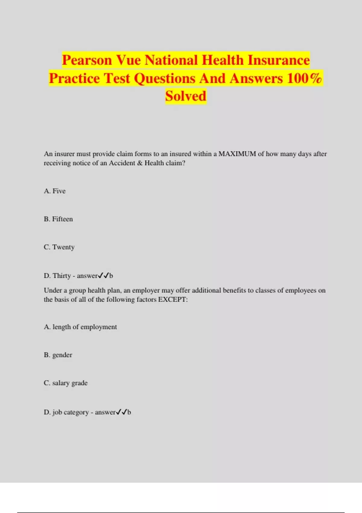 Pearson Vue National Health Insurance Practice Test Questions And Answers 100% Solved An insurer must provide claim forms to an insured within a MAXIMUM of how many days after receiving notice of an Accident & Health claim? A. Five B. Fifteen C. Twenty D. Thirty - answerb Under a group health plan, an employer may offer additional benefits to classes of employees on the basis of all of the following factors EXCEPT: A. length of employment B. gender C. salary grade D. job category - answerb Which of the following statements is CORRECT about a Waiver of Premium provision in a Disability Income policy? A. It allows the insurer to deduct premiums due from the disabled insured's benefit payments. B. It allows the insurer to increase the amount of premium during the insured's time of disability. C. It allows the insured to extend the length of the Grace Period while disabled. D. It allows the insured to maintain a policy in force while disabled and unable to pay premiums. - answerd Suicide, pre-existing conditions and self-inflicted injuries are dealt with in which of the following policy features? A. Extensions of coverage B. Benefits clause C. Riders D. Exclusions - answerd An insured becomes disabled three years after his Disability Income policy is issued. The disability is caused by a condition that existed prior to the policy issue date but was not specifically excluded from coverage. In this situation, the insurer will most likely take which of the following actions? A. Pay the full claim B. Pay the claim for a maximum of six months only