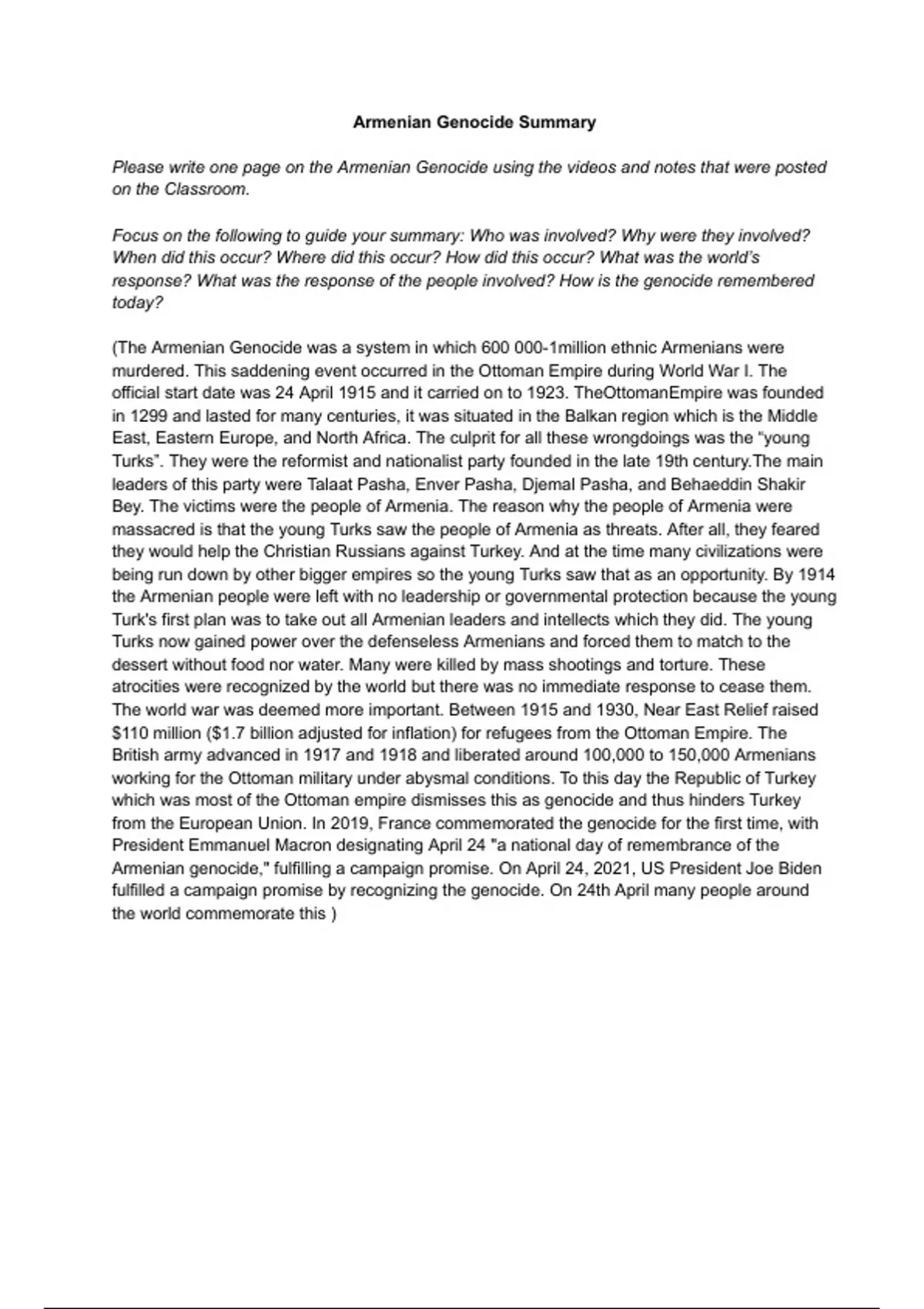 Please write one page on the Armenian Genocide using the videos and notes that were posted